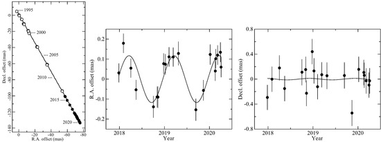 Using position measurements of J1745-2820 relative to Sgr A* from 2014 to 2020, and by fixing the parallax at 125 μas (8 kpc), proper motion was determined as (−3.136 ± 0.007, −5.555 ± 0.020) mas/year in right ascension and declination. After removing this proper motion from the original position measurements, a clear sinusoidal parallax signal was detected in RA with a one-year period, marking the first clear detection of Sgr A*’s parallax using this dataset (see Figure 4). The fitted parallax of 0.117 ± 0.017 mas translates to a Galacto-centric distance of approximately 8.5 kpc, which aligns well with recent estimates. We note, however, that a relative error of 15% is higher than that of other contemporary measurements. We expect that adding 150 more epochs over five years would reduce the parallax error to around 5.5%, since addition of 150 epochs provides a parallax error improvement by a factor of under an assumption of random error.