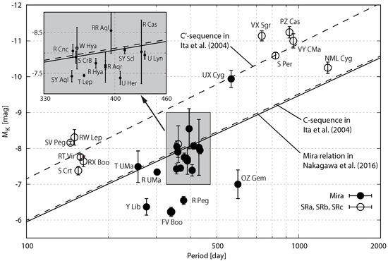Absolute magnitudes ()– diagram of the Galactic pulsating AGB stars. Filled and open circles indicate Mira variables and other types of variables (SR, red supergiant, and OH/IR stars). Distances of all sources are derived from astrometric VLBI. Solid line shows a relation for the Galactic Mira variables; ) reported in Nakagawa et al. [49]. The 12 sources with periods around 400 days are shown enlarged in the gray box at the top left. Dotted lines with labels C and C’ indicate two sequences in Ita et al. [47].