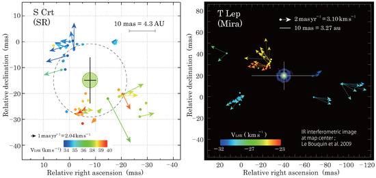 Astrometric VLBI observations provide spatial distribution and kinematics of circumstellar masers of AGB stars, too. In Figure 6, we present distributions and kinematics of circumstellar H2O masers associated to a semi-regular (SR) variable S Crt (left) and Mira variable T Lep (right) [50,51]. The size of the H2O maser distribution in S Crt is approximately 10 au, which is about one-third of that in T Lep (∼30 au). T Lep was observed with the Very Large Telescope Interferometer (VLTI) at J-, H-, and K-bands, and the image and size of the central star with its surrounding shell were obtained [52]. The infrared image of T-Lep [52] is overlaid in the right panel at the estimated position of the central star. Both results suggest anisotropic expansions of H2O masers around the AGB stars.