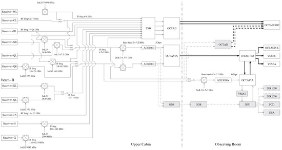 As shown in a block diagram of the VERA back-end system (Figure 8), VERA has two main streams of broad-band data: the one with conventional ADS1000 and/or ADS3000+ formatters developed by NICT [61,62], and the other with the newly developed OCTAD system developed by NAOJ. In the conventional data stream, the RCP and LCP RF signals received by the dual-beam receivers are converted to IF signals of 4.7–7 GHz. The receiver system was upgraded in 2019 for broad-band dual-polarized observations at K- and Q-bands, and since then, full polarization observations are available.