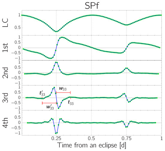 where P is the orbital period, and represents the time at either a local maximum or minimum around the primary (deeper) minima. Here, the index i denotes the order of the derivative, and j represents the index of the local extrema appearing near the eclipse time in the i-th derivative. Note that is used to maintain consistency with the numbering adopted in previous studies [24,25,26]. We also define as the time interval between and the corresponding primary eclipse time. In Figure 1, we show the times used in Equation (2).