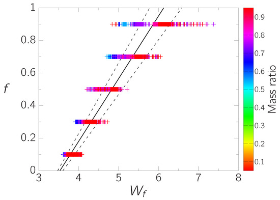 Relationship between (Equation (2)) and the fill-out factor f. The solid line represents the regression line. The dashed lines show linear regression fits of the RMSEs, as expressed by Equation (10), for each fill-out factor. The color gradient represents the mass ratio, ranging from 0 (orange) to 1 (red).