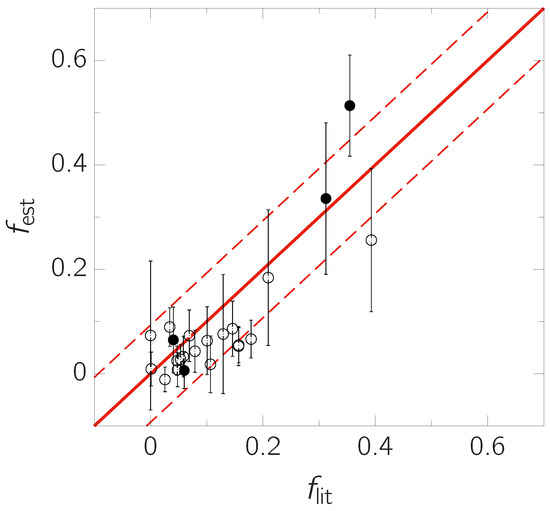 Comparison between the fill-out factors estimated by the proposed method () and those reported in the literature (). The filled and open circles represent the fill-out factors of the spectroscopic and photometric sample LCs, respectively. The solid and dashed lines show and , respectively.