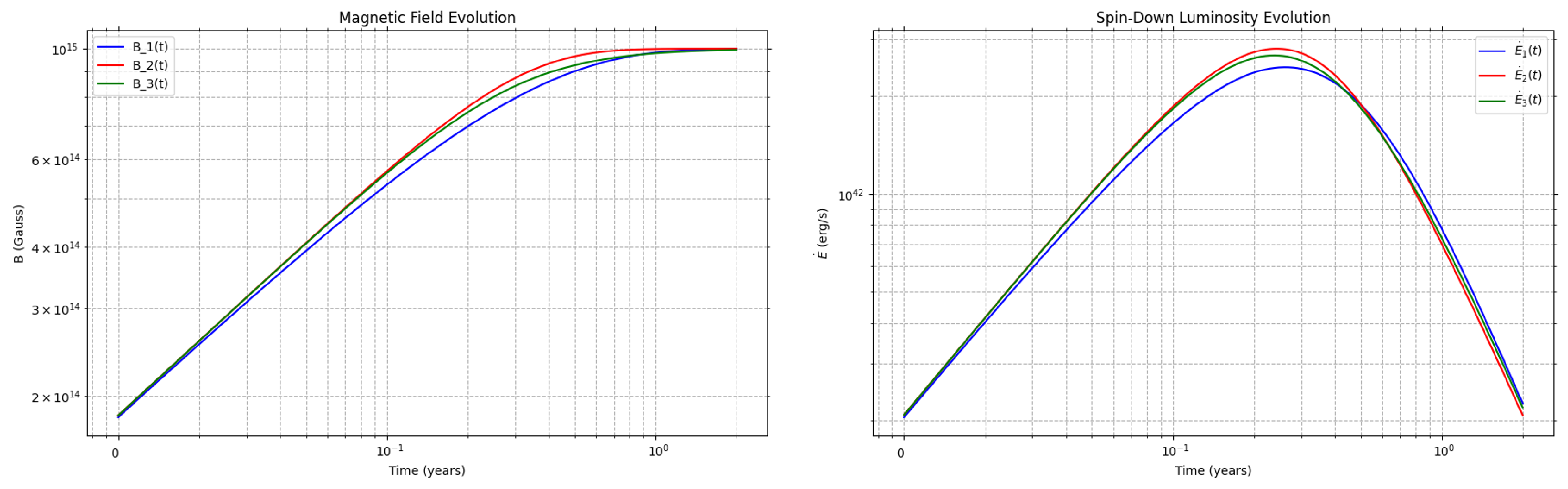 - Closed-form expressions for , , and feed directly into a synchrotron afterglow model, linking internal magnetar evolution to jet-scale energetics without additional nuisance parameters.