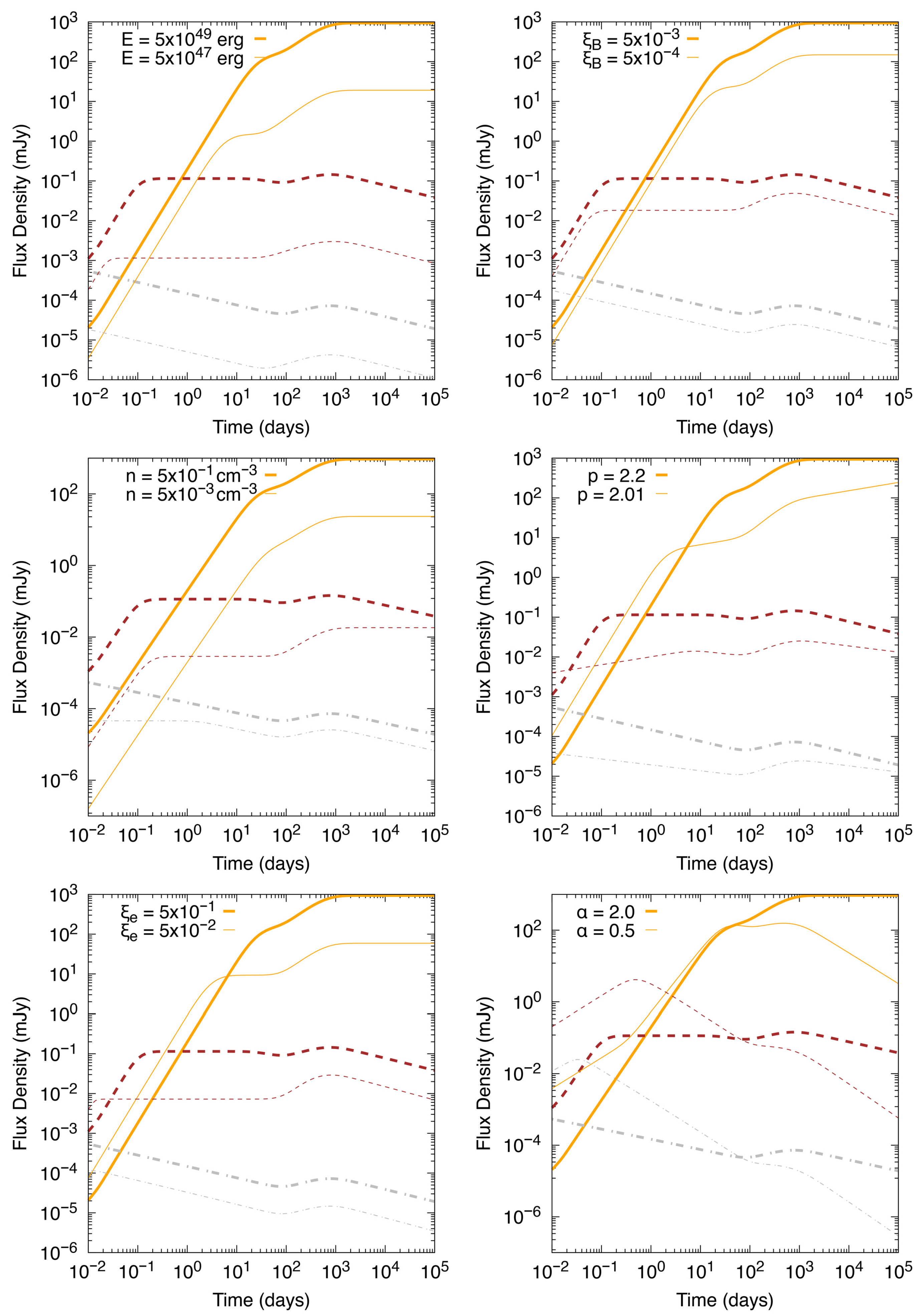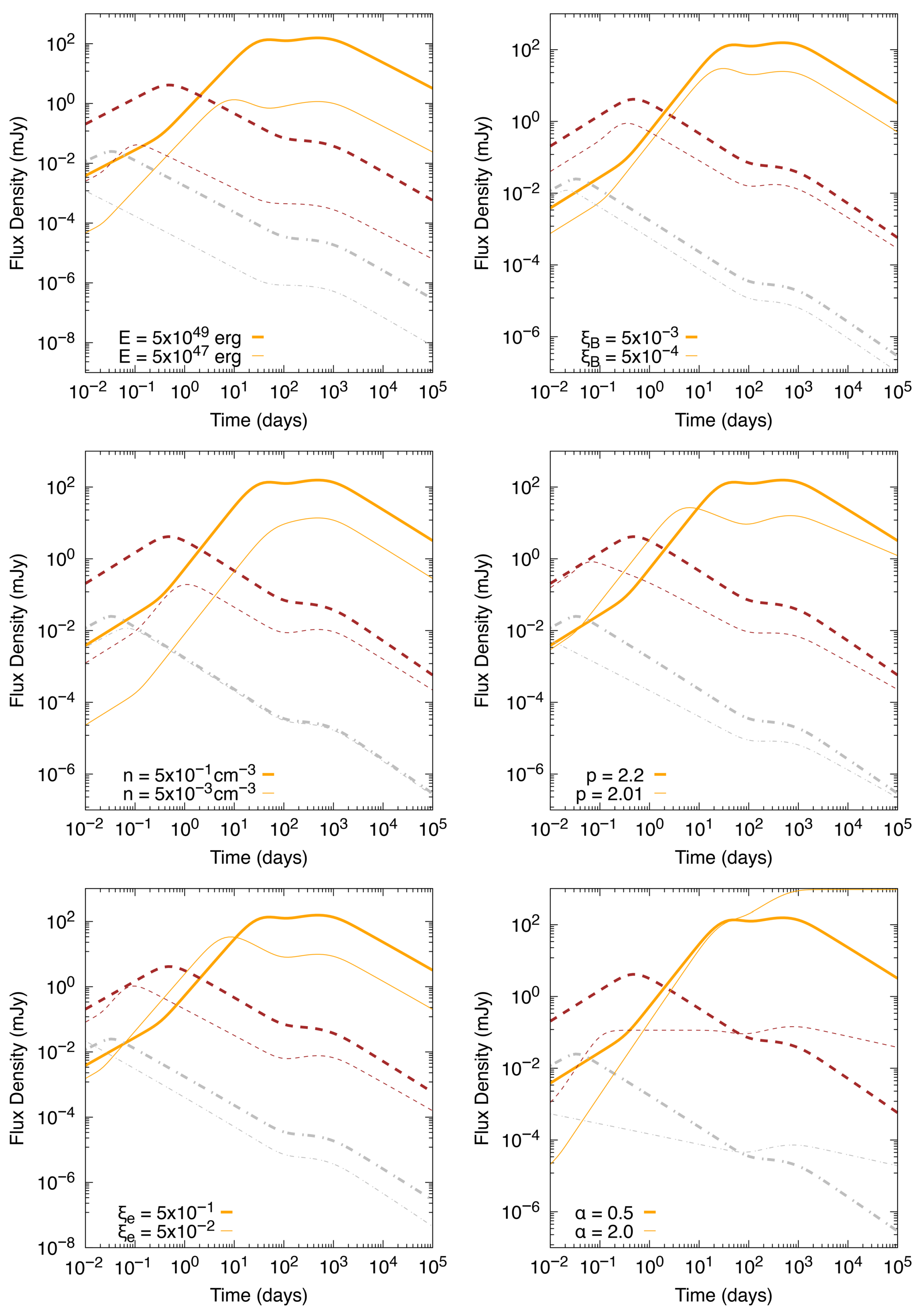 - Our framework self-consistently reproduces the timing, flux level, and spectral slope of late-time (–day) cm–mm “bumps”, while remaining agnostic about early X-ray behavior.