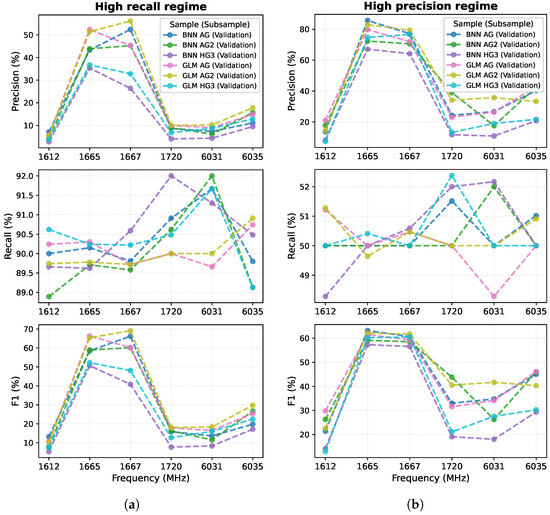 Metrics (precision, recall and F1) of different models as a function of OH maser transition frequency. Left panels (a) correspond to high-recall regime, while right panels (b) correspond to high-precision regime.