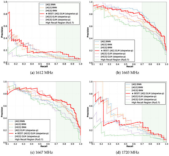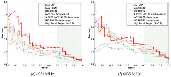 Precision–recall curves for OH maser prediction across all frequencies. Subfigures show different OH maser transitions. Each subfigure shows models from different surveys (AG, AG2, HG3) and training methods (BNN, GLM) for a specific OH transition. The curve with the highest partial AUC–PR in the high-recall region () is highlighted. The green shaded region indicates the evaluation range. Different panels (a–f) represent different OH maser transitions.