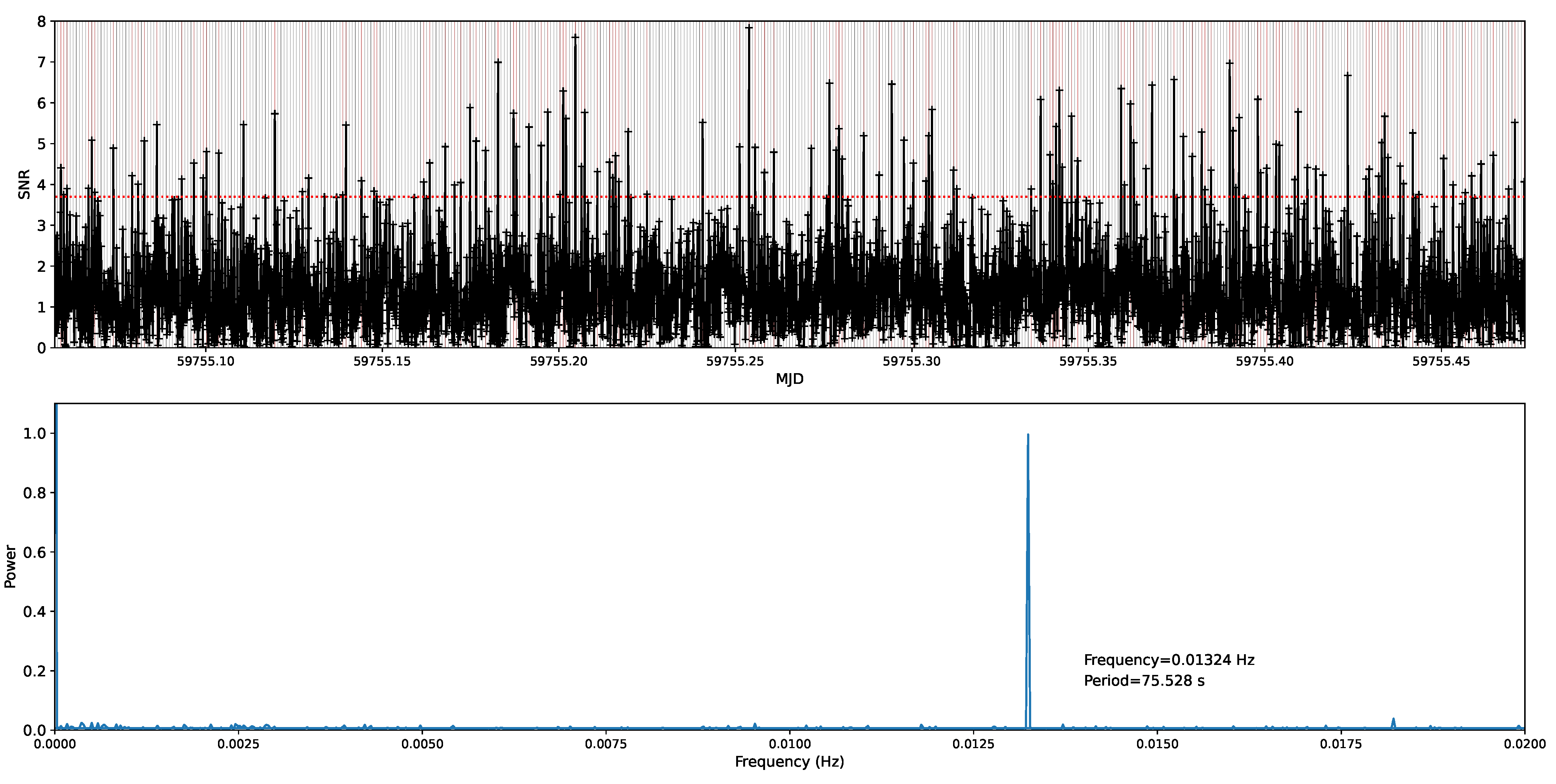 - Caleb, M.; Heywood, I.; Rajwade, K.; Malenta, M.; Willem Stappers, B.; Barr, E.; Chen, W.; Morello, V.; Sanidas, S.; van den Eijnden, J.; et al. Discovery of a radio-emitting neutron star with an ultra-long spin period of 76 s. Nat. Astron. 2022, 6, 828–836. [Google Scholar] [CrossRef]