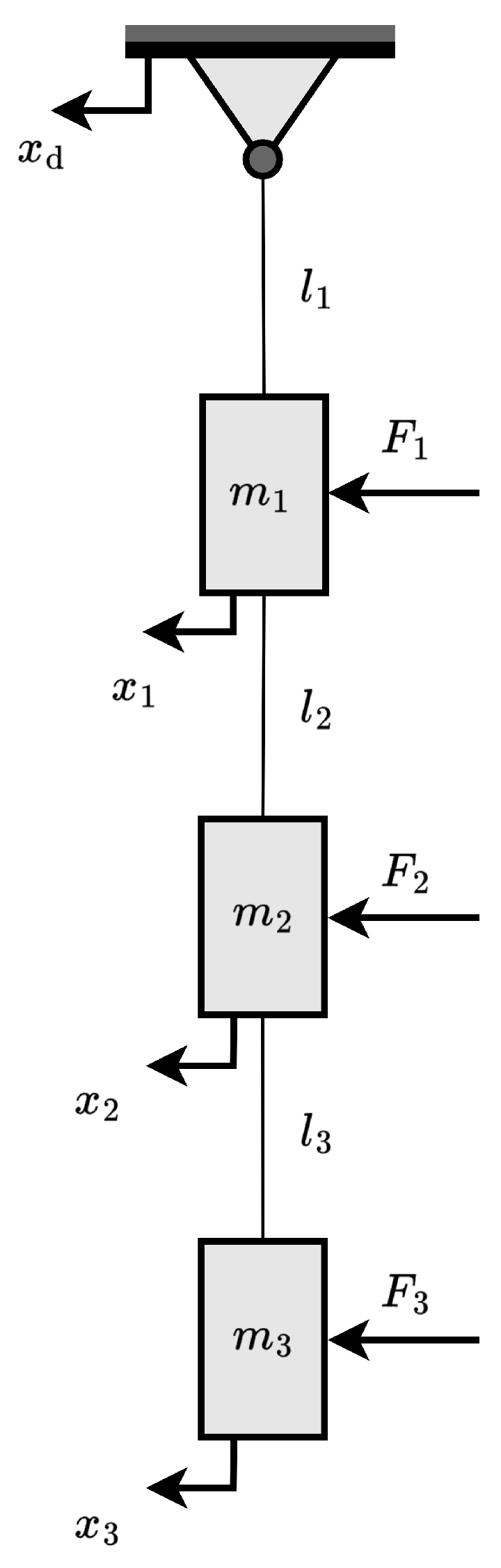 In order to demonstrate non-smooth optimization methods, the dynamics of the payload suspension can be represented with sufficient accuracy by a multi-pendulum system. In this study, we consider a three-stage, three degree-of-freedom (DoF) pendulum that is actuated at the mirror and both upper stages. A schematic model of the plant is shown in