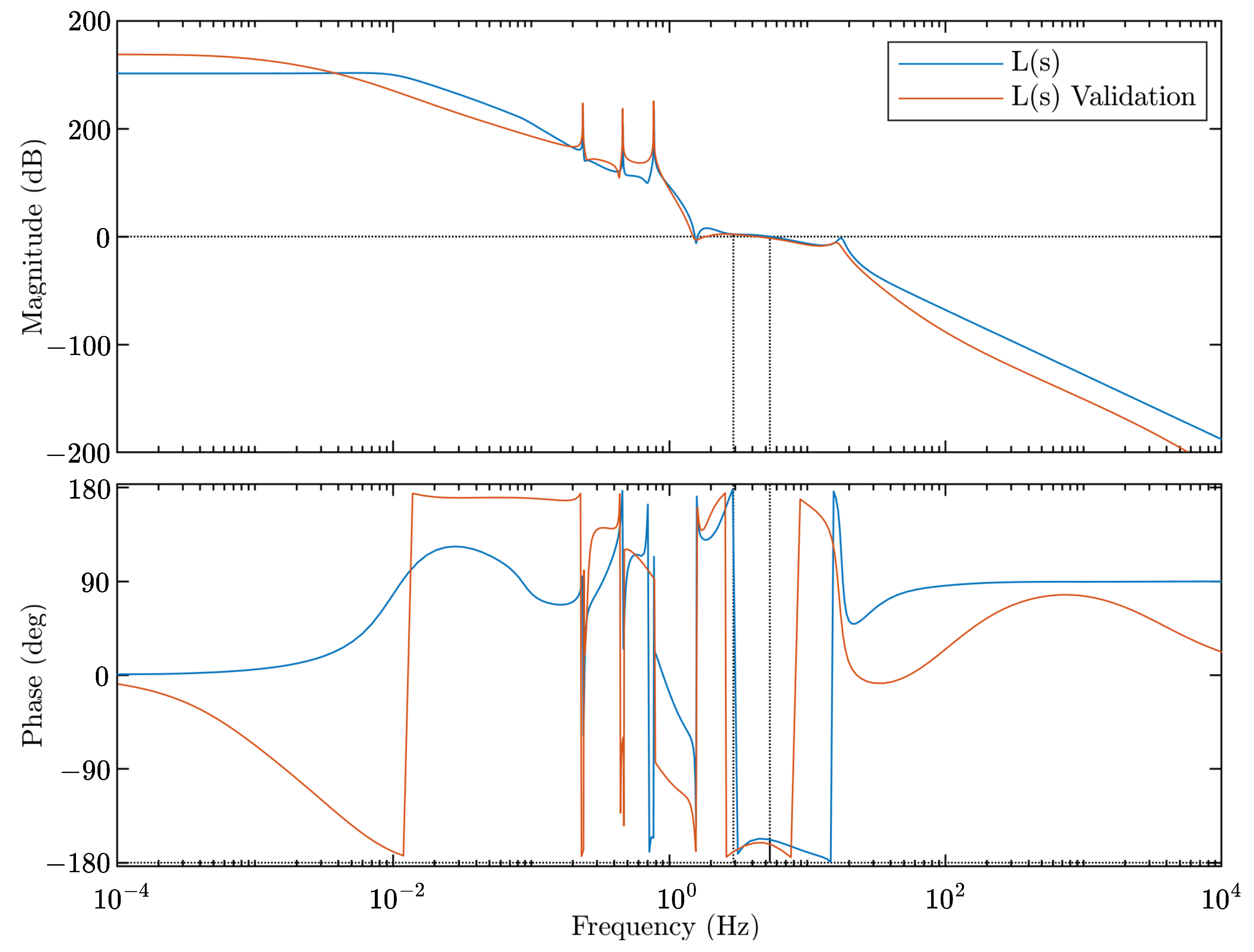 Bode plot of the loop gain and validation. The stability margins are shown for the blue plot, corresponding to the results that are presented in the main text.