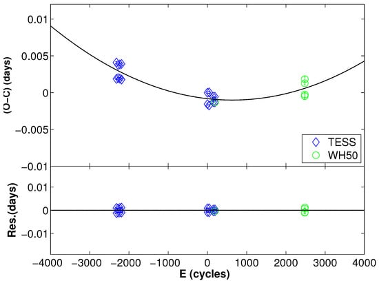 the diagrams of are obtained and displayed in Figure 3. The diagram of illustrates an upward parabolic change. By using the least square method to fit the curve, we derived the following ephemeris formula: