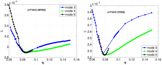 During the q-search process, we observed that certain trial mass ratios did not converge even after 200 iterations for the target J171815. To address this, we expanded the q-search approach to incorporate modes 4 and 5. Mode 4 is intended for semi-detached binary systems in which the primary star fills its critical Roche lobe, whereas mode 5 applies to semi-detached systems where the less massive component reaches its Roche lobe. Eventually, convergent solutions for J171815 were obtained under modes 3, 4, and 5. The plots illustrating the correlation between the tested mass ratios q and the sums of weighted squared deviations are displayed in the left panel of Figure 4.
