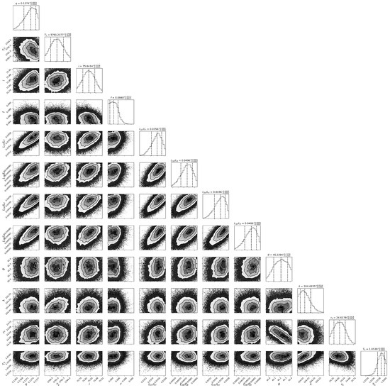 Given that third components are prevalent in most W UMa-type contact binary systems, we explicitly treated the third-light component (l3) as a free parameter in the photometric modeling using the W–D code. The corresponding fitting results have been supplemented in Table 2, labeled as “ (with third light)” and “TESS (with third light)”, respectively. These results demonstrate that even when the third-light parameter is freely optimized, the system retains its extreme low-mass-ratio nature (). To obtain more precise results, we employed the Contact Binary Light-curve Analyzer (CBLA; Li et al. [49]), a software package based on PHOEBE [50,51,52,53] that utilizes a neural-network model for rapid multi-band light-curve analysis of contact binaries. Figure 6 displays the corner plots derived from CBLA, while the left panel of Figure 7 presents the corresponding light-curve fits. We found that simultaneous fitting of all four bands yielded suboptimal results, potentially due to magnetic activity effects, as the observations were not obtained simultaneously. Given the high precision of TESS data, we separately processed the TESS observations using CBLA. The resulting corner plots and fitted light curves are shown in Figure 8 and the right panel of Figure 7, respectively. The derived physical parameters, presented in Table 3, are similar with those obtained from the W–D analysis. It is important to note that since the actual contribution fraction of third light cannot be uniquely determined from the available photometric data, there is an inherent degeneracy between third light and other parameters such as mass ratio and luminosity ratio. This phenomenon is a common challenge in multi-parameter photometric modeling, especially for systems with low-amplitude light curves, where the dilution effect of third light and the luminosity contribution of the secondary component are difficult to fully disentangle.