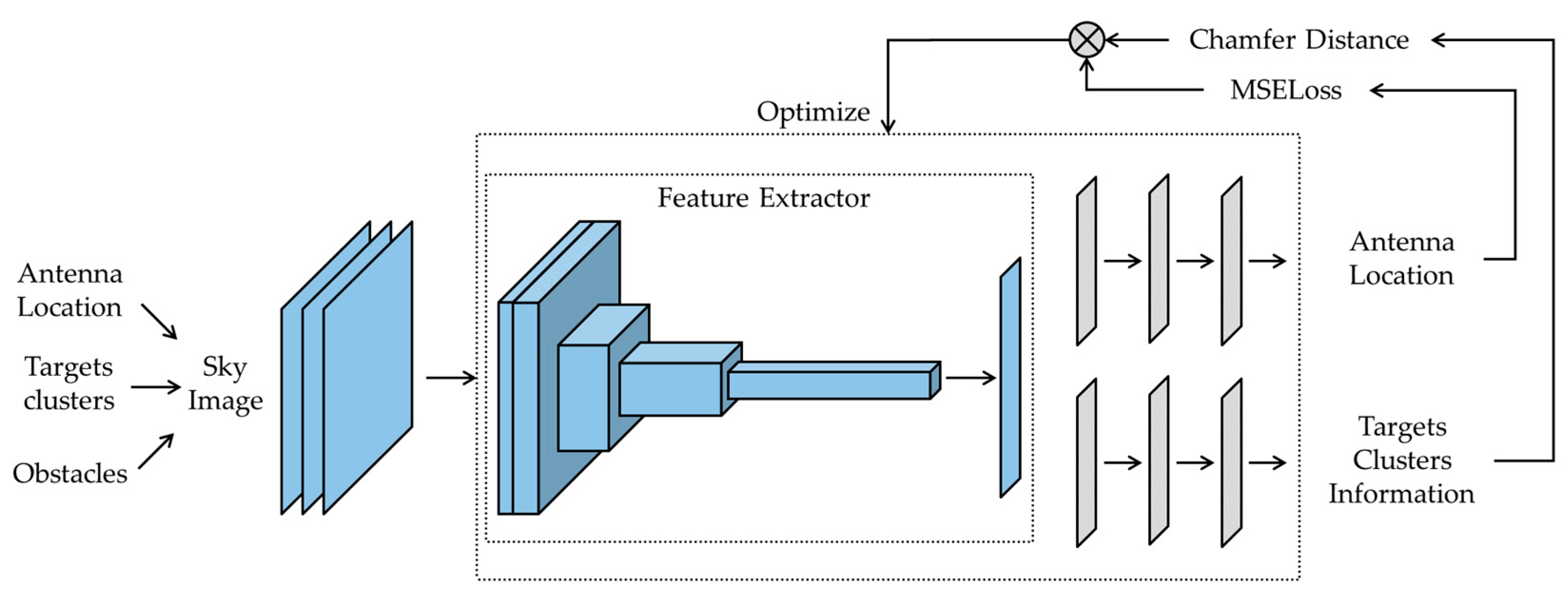 - Target cluster information: attributes for up to 8 target clusters, including their position, size, and obstructed status. Specifically, this consisted of cluster coordinates (X ∈ [−1, 1], Y ∈ [−1, 1]) and normalized cluster size (size ∈ [−1, 1]). Target clusters outside of the telescope horizon were masked out, and obstructed target clusters were given a negative size to encode their unobservable status.