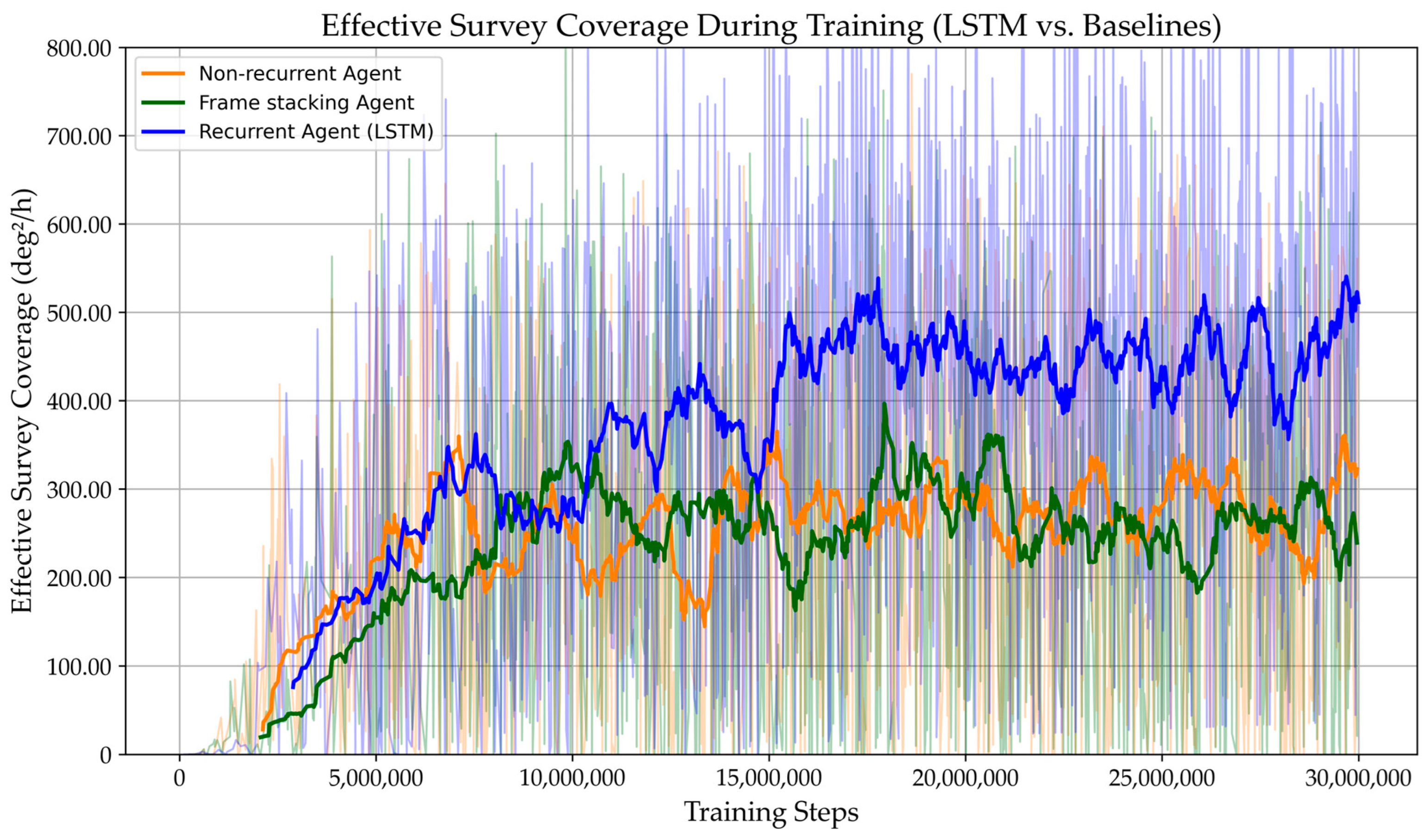 | Agent Architecture | Training Steps to Convergence | Mean Survey Coverage (deg2/h) | Relative Improvement (vs. Non-Recurrent) |