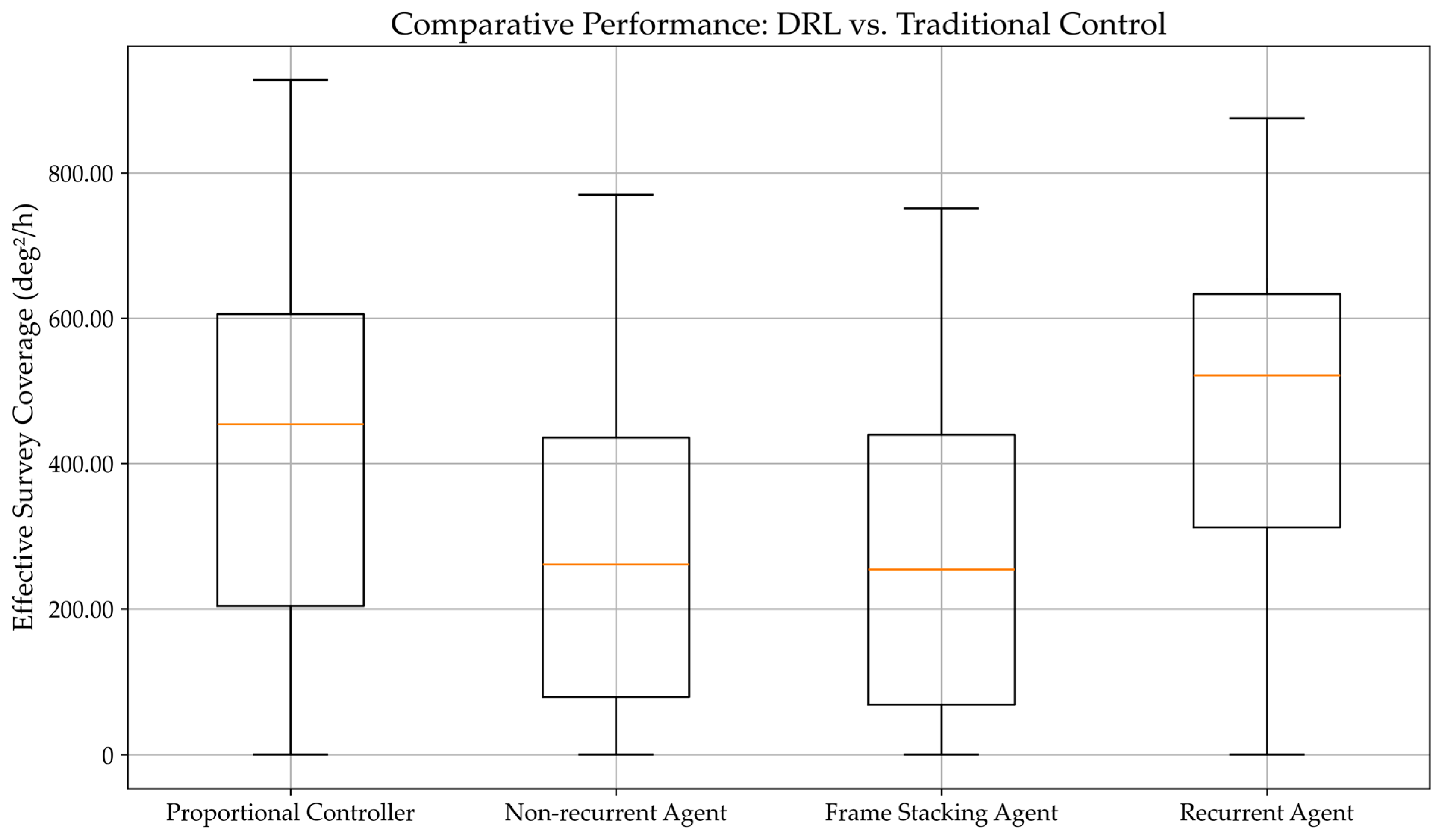 - The LSTM policy achieved the highest median survey coverage of 521 deg2/h, surpassing the traditionally tuned proportional controller.
