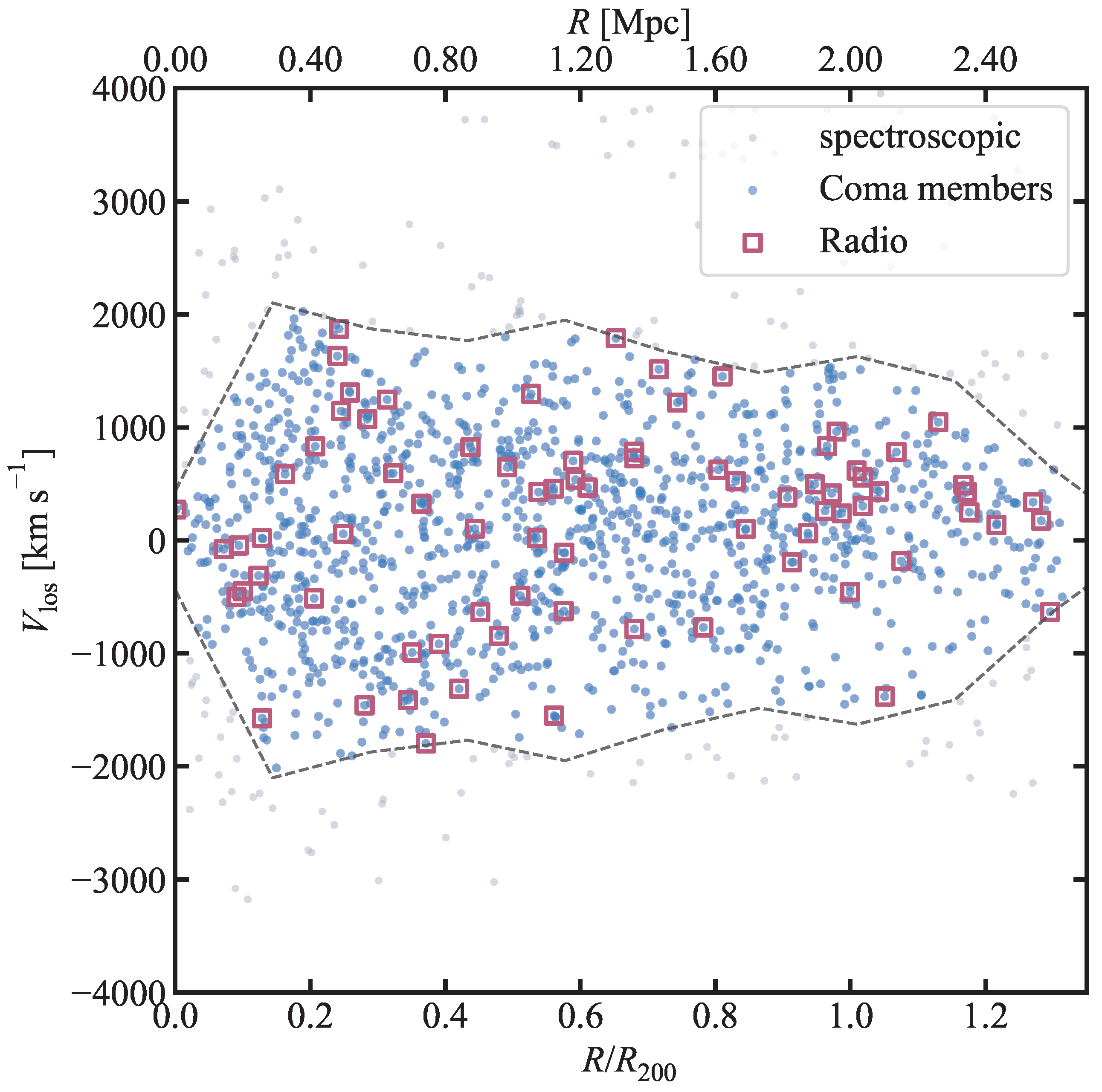 - Serra, A.L.; Diaferio, A. Identification of Members in the Central and Outer Regions of Galaxy Clusters. Astrophys. J. 2013, 768, 116. [Google Scholar] [CrossRef]