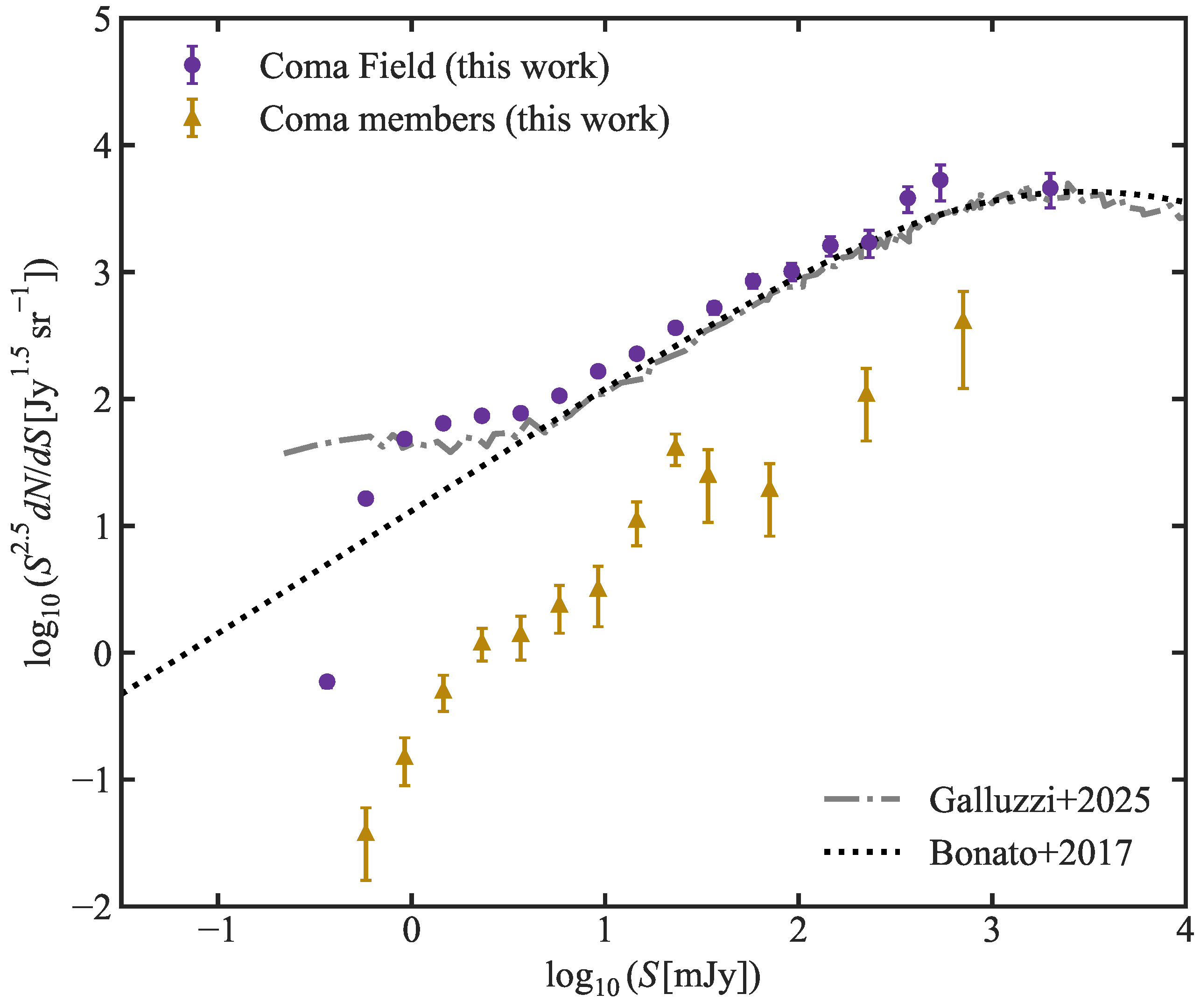 - The Number and Morphology of Radio Sources. Thanks to LOFAR’s superior sensitivity, we present the most comprehensive catalog of radio members of the Coma Cluster to date. Our sample (79 members) more than doubles the population identified at 1.4 GHz by Miller et al. [19] and substantially expands upon the 24 members recently surveyed with uGMRT by Lal et al. [20]. The observed source count distribution (logN-logS) shows a slight excess above the average trend, but it is not contributed by radio activity within the cluster. Our 79 radio members are classified into 31 compact sources, 25 extended sources, and 23 tailed structures. Compared with existing reports [7], the proportion of extended sources is significantly higher, while the proportion of compact sources is markedly lower, regardless of whether the system is merging or relaxing. However, the proportion of tailed sources is comparable to that of the merging system.