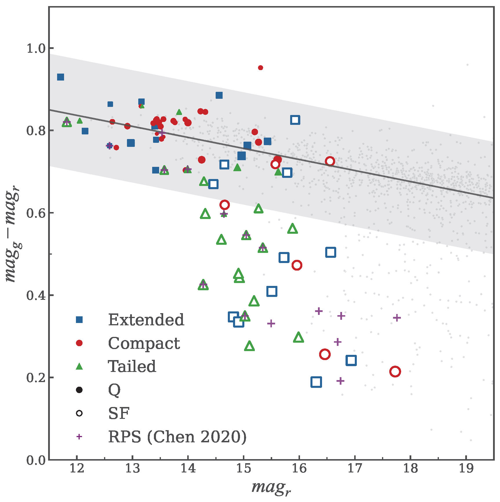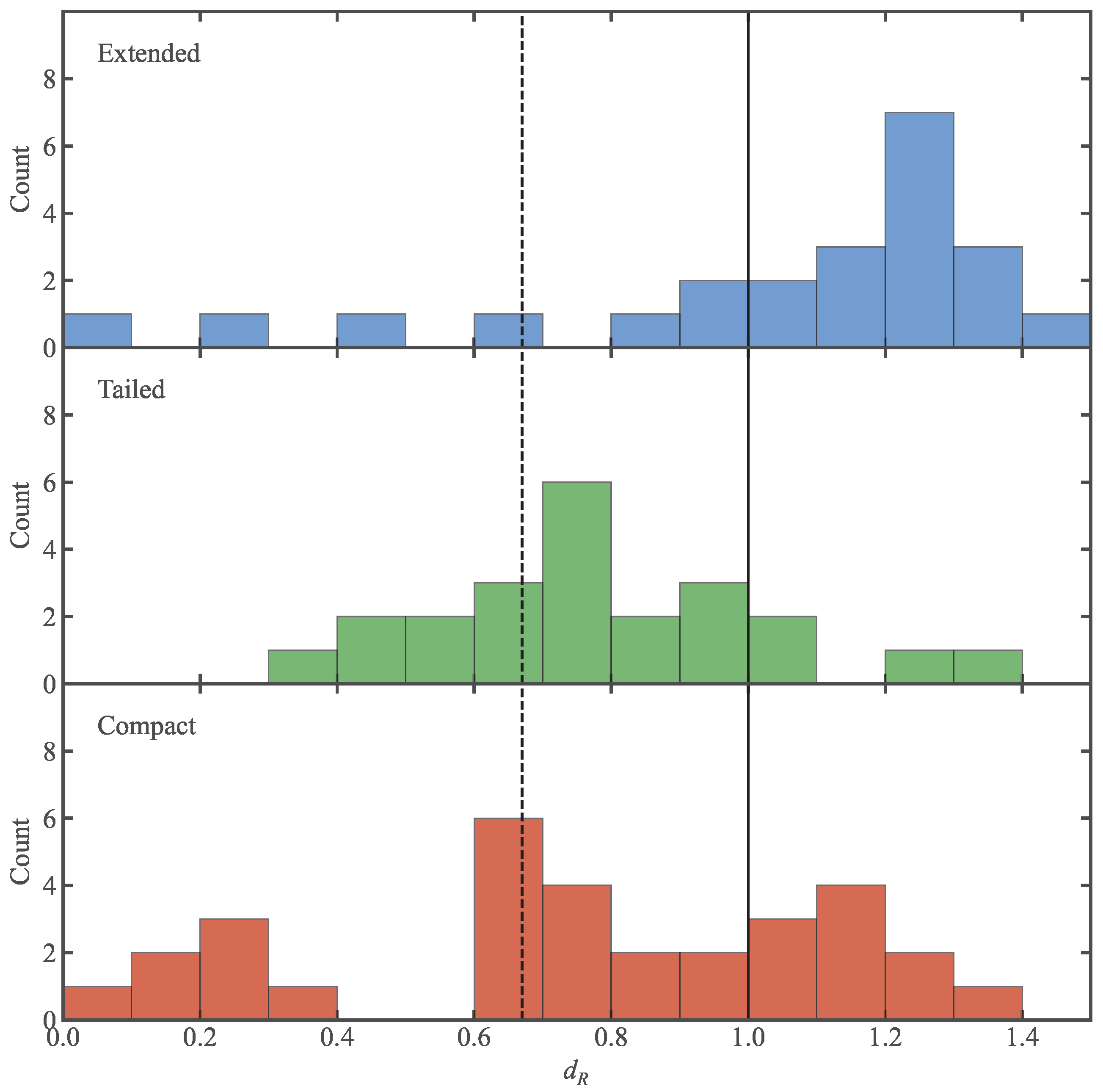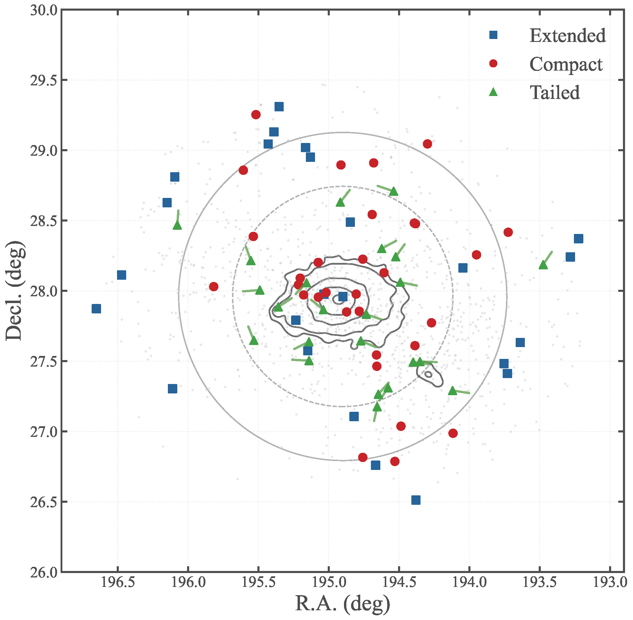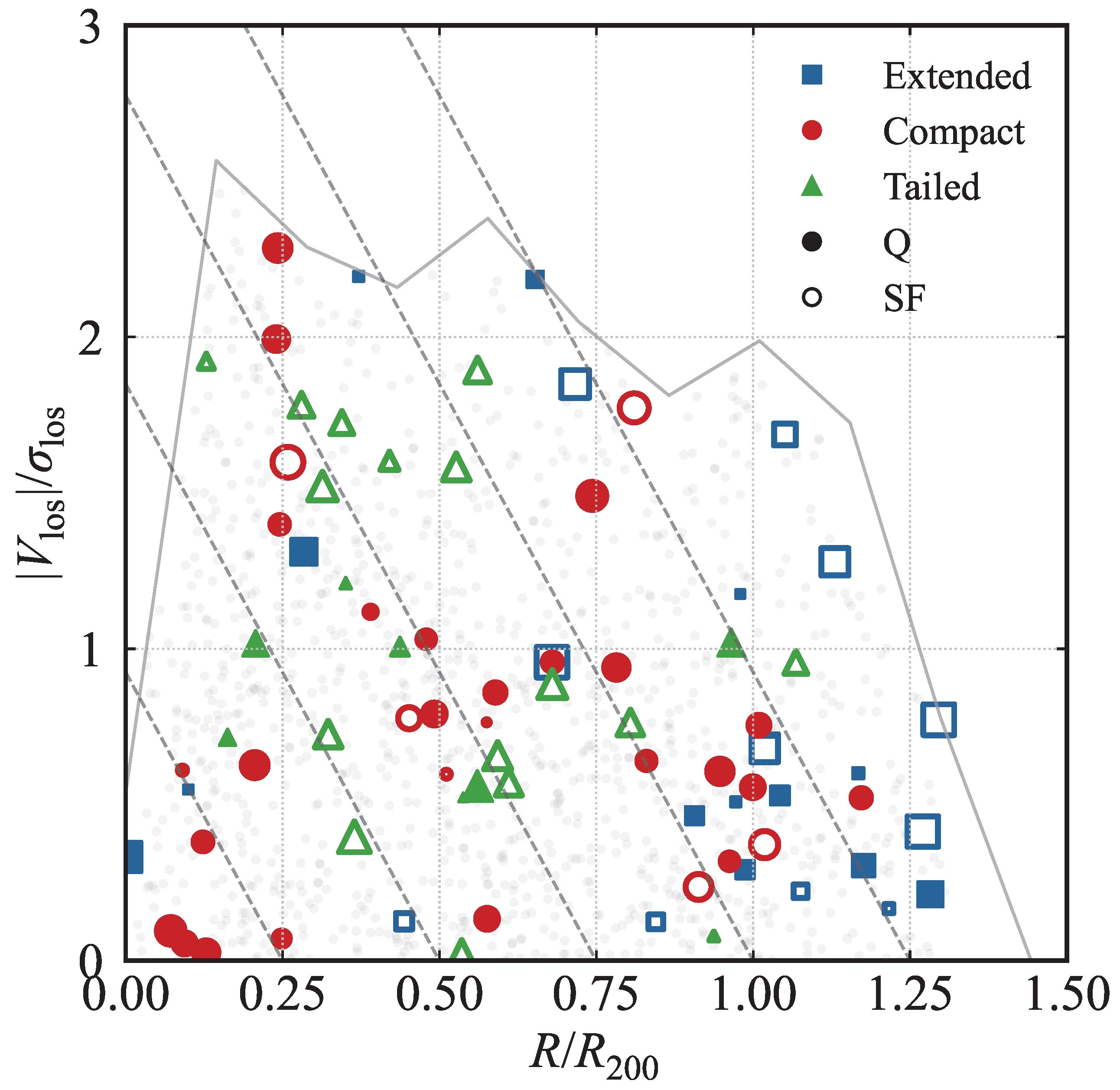 - Phase-Space Evolution. Using the phase-space distance () as a proxy for infall time, we mapped the distinct environmental histories of these populations. Extended (E) sources are preferentially located in the cluster outskirts (), where they are entering the cluster environment for the first time and remain relatively undisturbed. Tailed (T) sources are concentrated in the infall region (), confirming that the transformation of galaxy morphology via ram pressure stripping is most active during the first infall into the high-density .