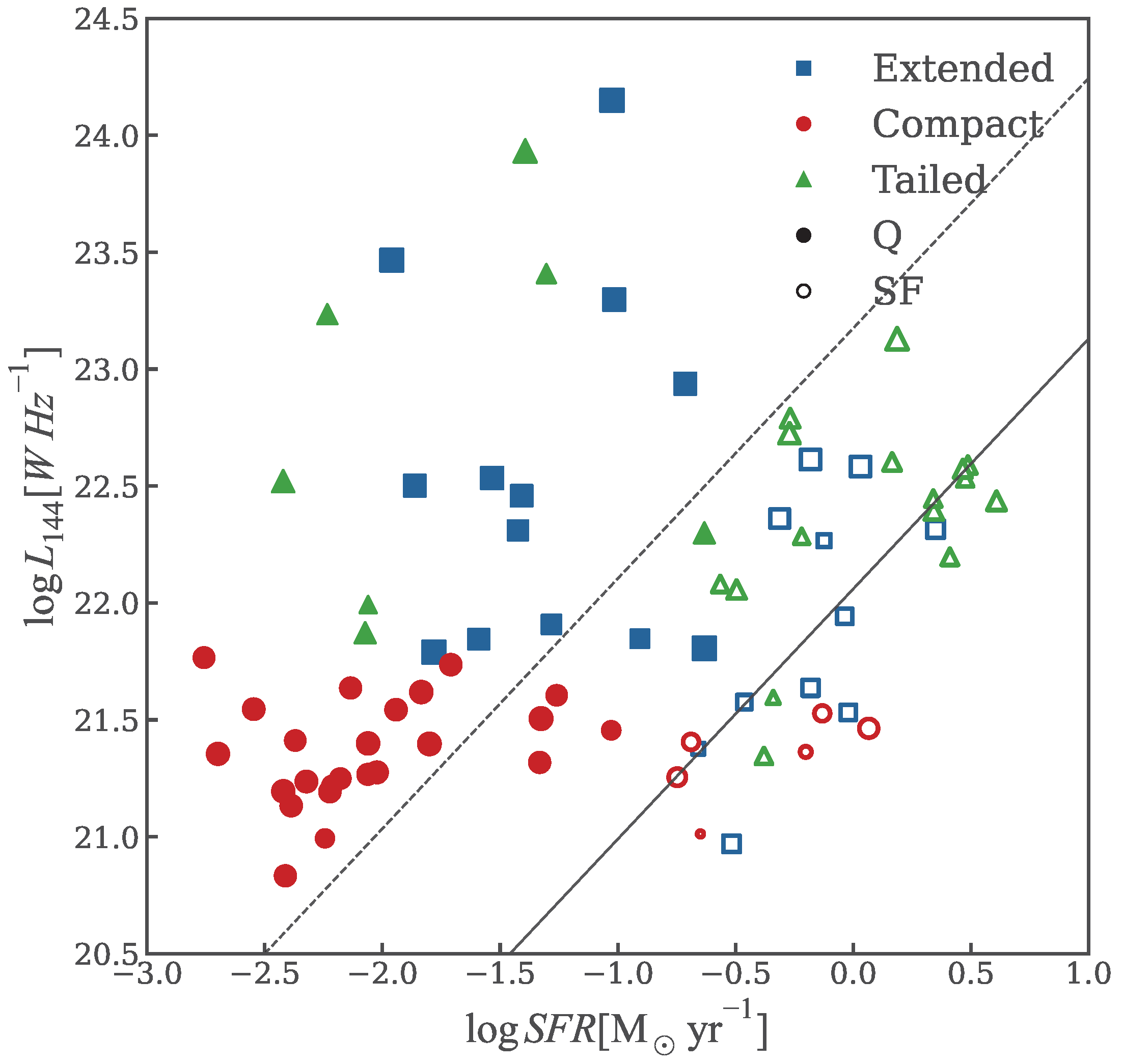 - Bimodal Nature of Radio Hosts. The radio population exhibits a clear bimodality in the star formation rate versus stellar mass plane, separating into massive quiescent galaxies and active star-forming systems. This optical state is strongly correlated with radio morphology. Compact (C) sources are predominantly hosted by massive, quiescent galaxies on the red sequence. Their radio emission exceeds the level expected from star formation alone, confirming it is dominated by central activity. Tailed (T) sources are largely associated with star-forming galaxies. Their alignment with the star-forming main sequence and their specific morphologies indicate that their radio emission originates primarily from star formation activity occurring within gas stripped by ram pressure.