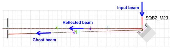 Spurious beams, known as ghost beams, arise from residual reflections and transmissions within optical elements, depending on the residual reflectivity and transmissivity of their coatings or substrates. Figure 5 shows a simulation of ghost-beam generation: the incident beam is partially transmitted through the first surface of a mirror, then partially reflected by the second surface, and finally transmitted again in a direction determined by the mirror’s wedge angle. As this beam propagates, it can encounter scattering surfaces, and a fraction of it may re-couple into the interferometer beam.