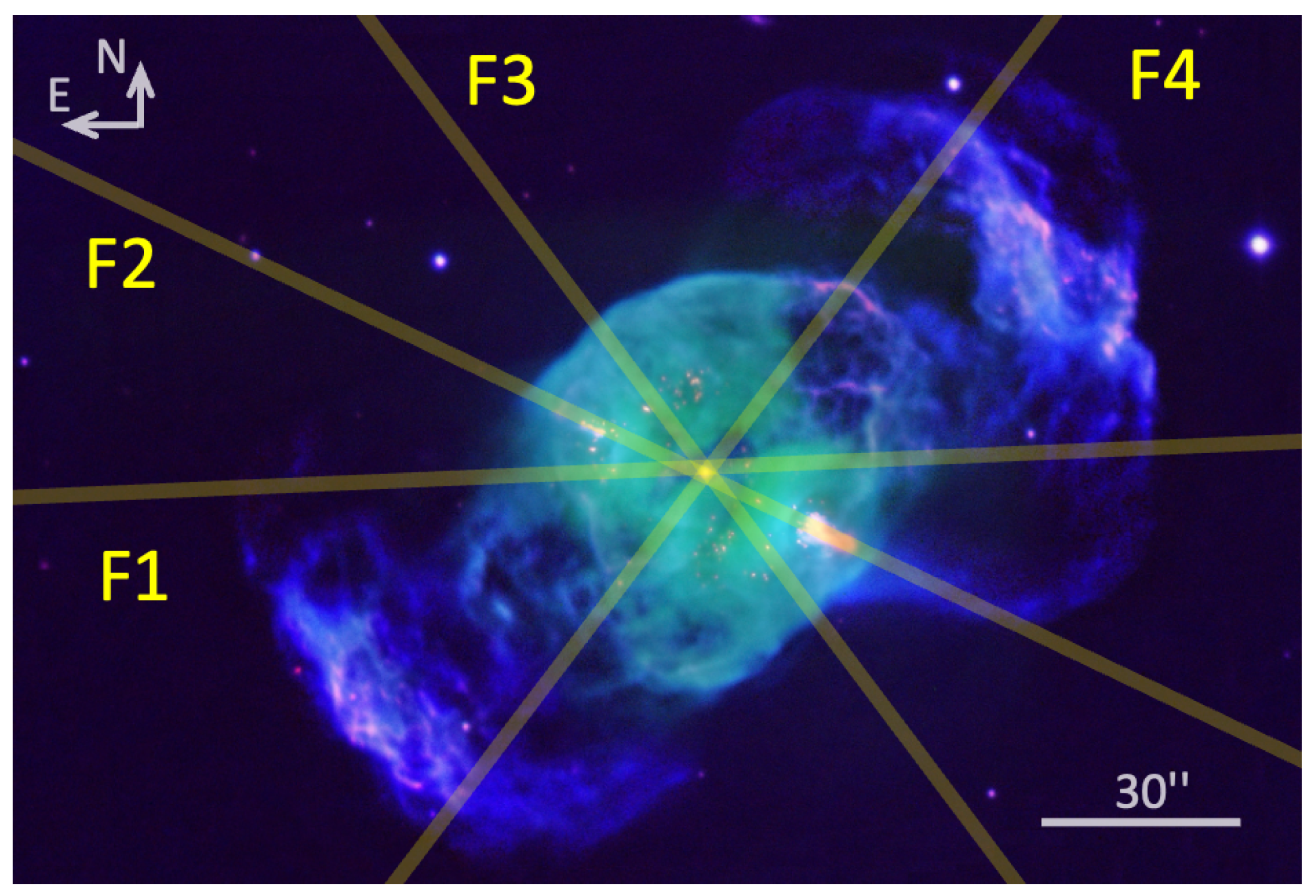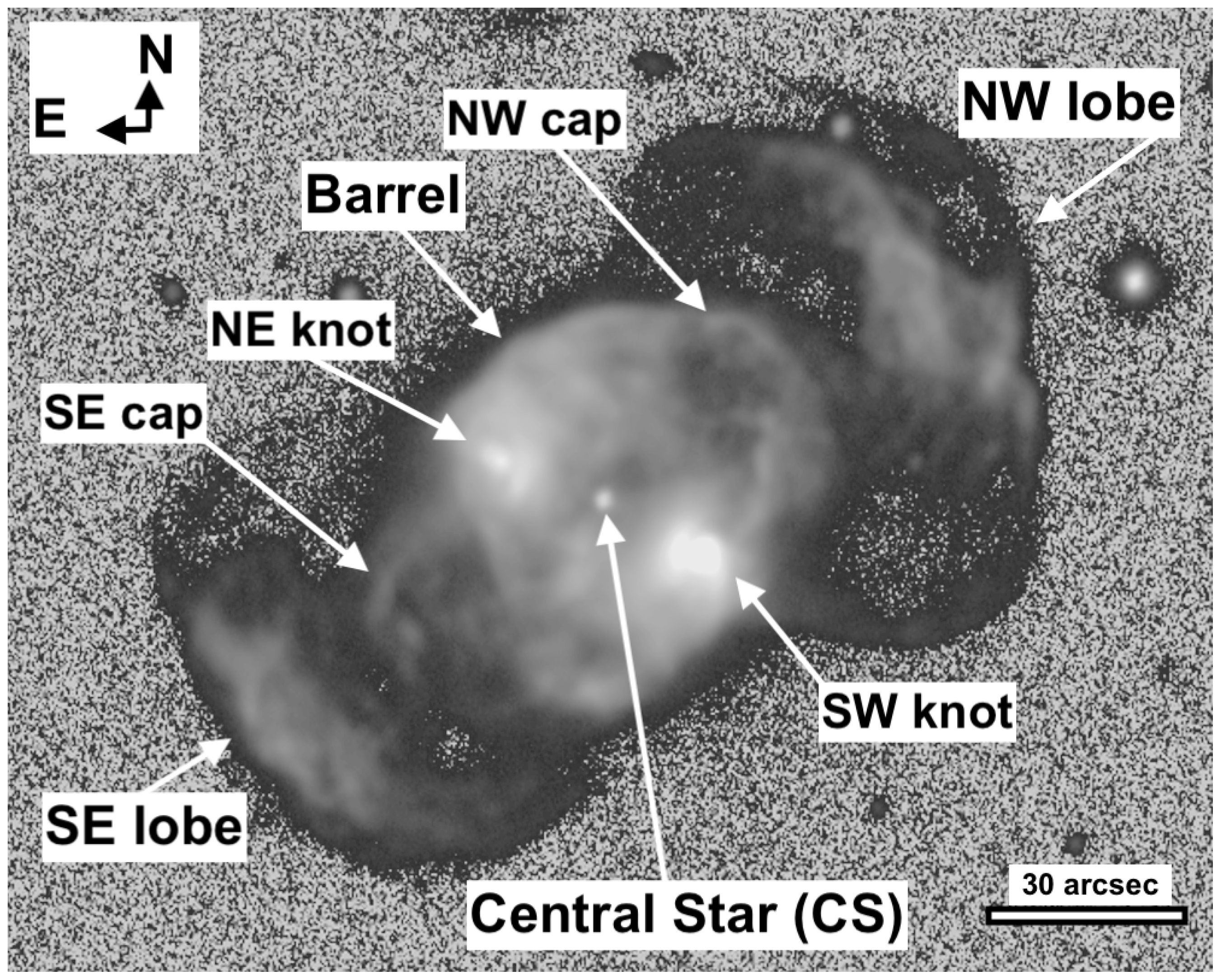 - Guillén, P.F.; Vázquez, R.; Miranda, L.F.; Zavala, S.; Contreras, M.E.; Ayala, S.; Ortiz-Ambriz, A. Multiple outflows in the planetary nebula NGC 6058. Mon. Not. R. Astron. Soc. 2013, 432, 2676. [Google Scholar] [CrossRef]