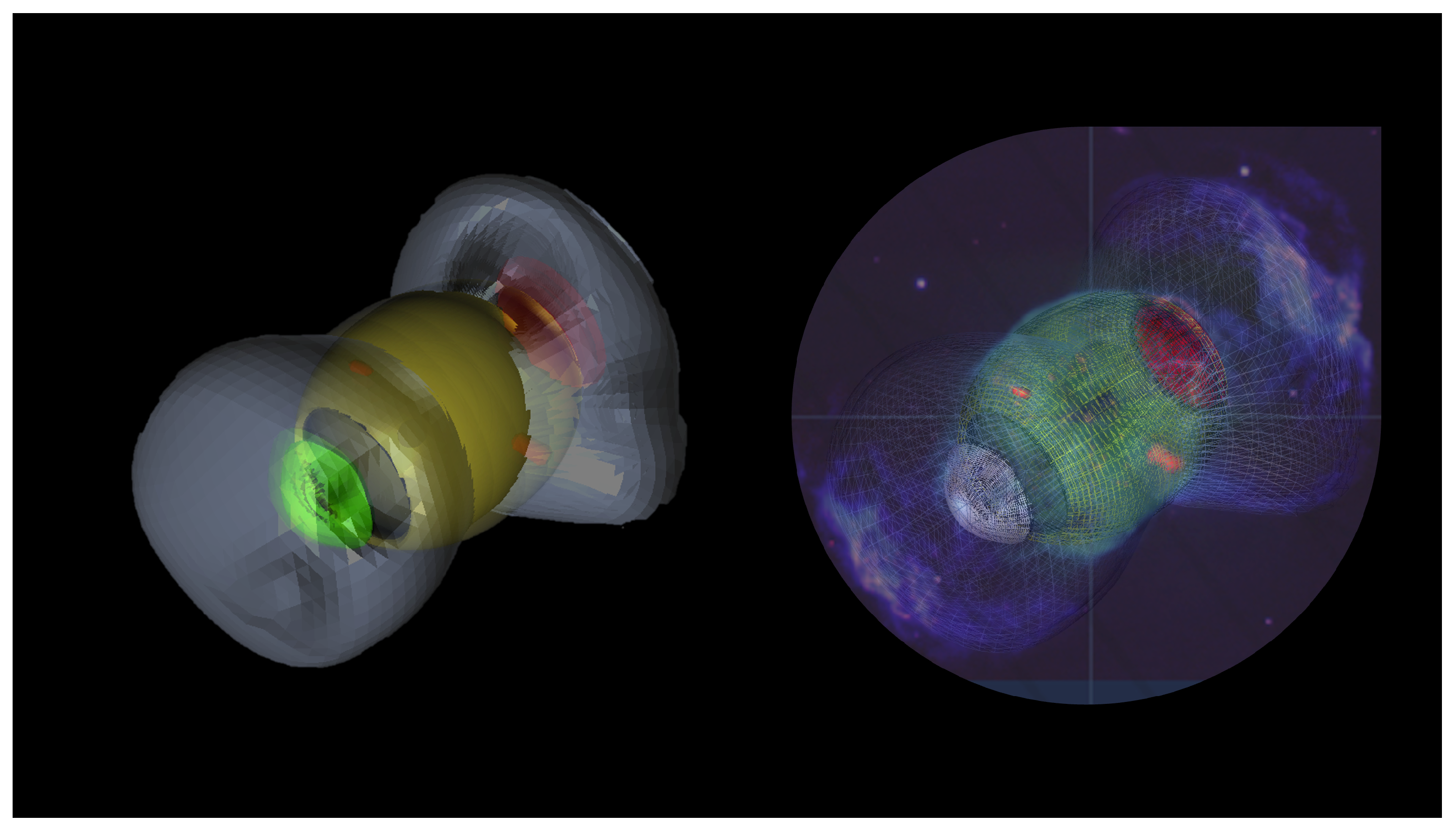 - At this stage, the modifiers SIZE or SQUEEZE are applied to transform the sphere into an ellipsoid or even into a bipolar structure. In some cases, only a section of these surfaces is employed to reproduce the observed morphology. For example, an ellipsoid may be used to represent a cap, but this does not imply the existence of the entire ellipsoid, only the region that matches the observed feature. This approach allows us to both estimate the distance from the geometric centre to the cap and assign a velocity law consistent with its expansion.