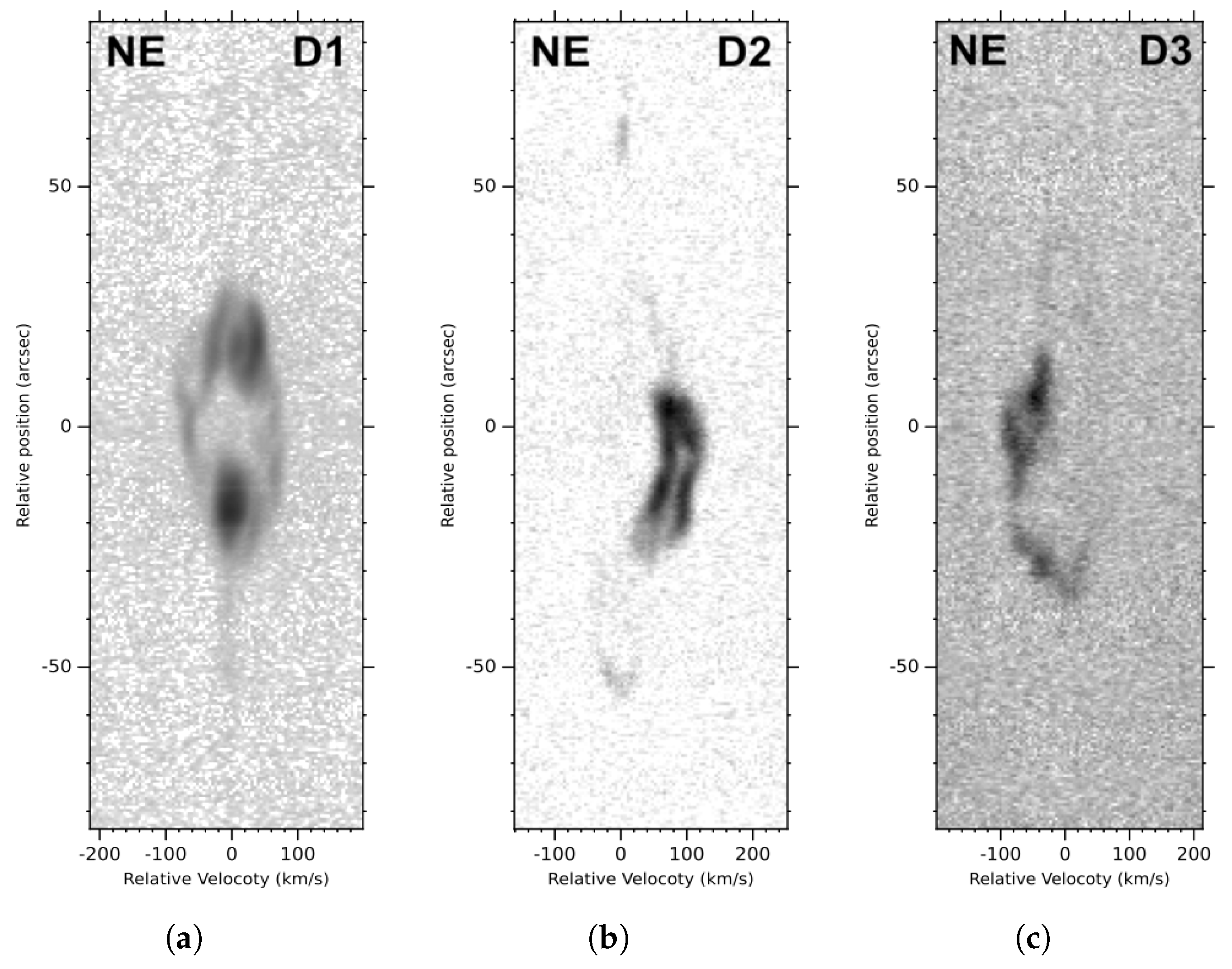 - The same procedure is then repeated for each additional structure. In practice, it is often more effective to begin with a single PV diagram and, once a convincing fit is obtained, to test whether it also reproduces other PV diagrams. This process is continued until a robust final model is reached, in which all structures reproduce satisfactorily both the morphological and kinematic characteristics observed in the images and spectra.