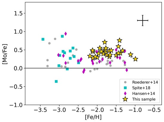 [Mo/Fe] abundance ratios as a function of [Fe/H] for our sample of stars (gold star symbols) compared to results from [14] (magenta diamonds), [15] (grey filled circles), and [16] (cyan squares). A representative error bar is plotted in the upper right corner. The error bar shows the average line-to-line scatter () for [Fe/H] and for [Mo/Fe].