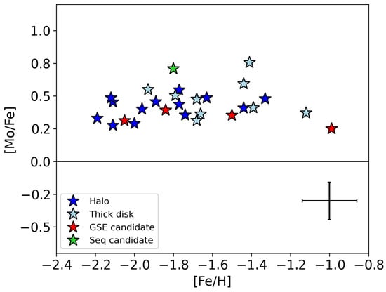 [Mo/Fe] abundance ratios as a function of [Fe/H] for our sample of stars. Different colours represent different kinematic groups: Milky Way halo (blue), Milky Way thick disc (light blue), Gaia-Sausage-Enceladus (GSE) candidates (red), and Sequoia (Seq) candidates (green). A representative error bar is plotted in the lower right corner.