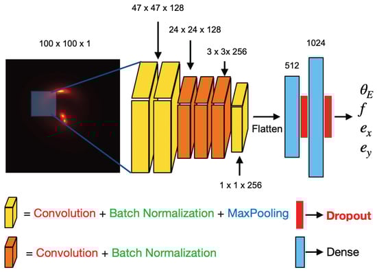 The primary objective is to train an AlexNet-modified CNN (described later) to predict the four characteristic parameters of the SIE model (, f, , ) for lens modeling, assessing the performance of the CNN model under three conditions in which the dropout layers were altered. As mentioned previously, the dataset was partitioned into 70,000 images for 4-fold cross-validation for training and validation and 6396 images for independent testing. In the 4-fold cross-validation scheme, each fold used 75% of the images for training and 25% for validation. A crucial element of the dataset is the binary format used to store images, namely TFRecords, which efficiently stores data sequences, optimized for use with TensorFlow [59]. This format is ideal for large datasets, as it allows for more compact storage and faster data reading during model training, even if the data do not fit completely in memory. This format facilitates the systematic labeling and organization of images, allowing a single file to be partitioned into training, validation, and test samples. Furthermore, the format’s support for grayscale images streamlines the preprocessing procedures.