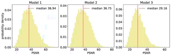 PSNR values for all the images used in test where the red dotted line indicates the median value. It can be seen that the predictions of Models 1 and 2 generate images with high quality compared to the third model.