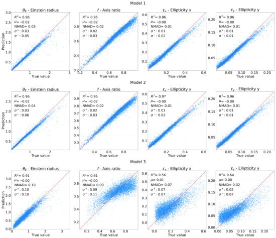 Figure 9 presents the scatter distribution between the true and predicted values of the SIE parameters. Exact predictions lie on the 45-degree diagonal (solid red line), and ideal predictions correspond to a distribution tightly aligned with this line. As anticipated, Models 1 and 2 show broadly consistent results: they exhibit a higher predictive accuracy for low values of , while a systematic bias becomes apparent for . This can be associated with the values of utilized for training, as depicted in Figure 3. This figure illustrates a significant concentration of values within the range of . Similarly, the parameter f displays a noticeable bias for , where the models systematically underestimate the true values. For components and , the bias is even more pronounced in the regimes and , respectively. In contrast, Model 3 shows the largest dispersion and bias among the three, clearly revealing the significant impact of dropout on the quality of the predictions. To assess the uncertainties of the models, we also computed the bias, the standard deviation and the NMAD, which serve as indicators of the accuracy of the predictions. The results of these metrics reveal that Models 1 and 2 exhibit a negligible systematic bias () but extremely low NMAD values between 0.01 and 0.04, confirming that predictions are highly certain and present minimal dispersion with respect to the line of truth. In contrast, while Model 3 maintains a low average bias (), its high residual dispersion (NMAD ≈ 0.07–0.10) indicates a regime of high variance that limits its reliability for individual parameter inference.