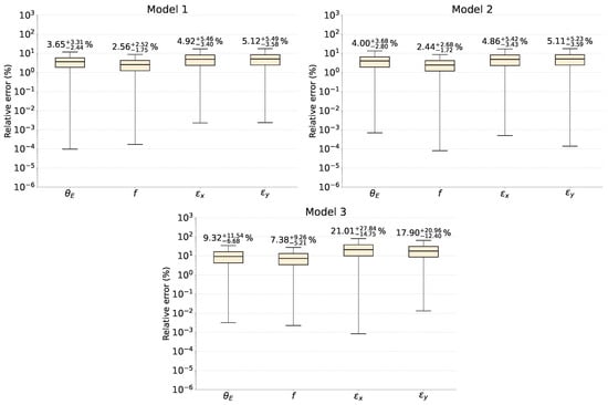 Finally, the relative errors of the SIE parameters for the three CNN architectures are presented in Figure 10. The values shown at the top of each boxplot correspond to the median relative error of the associated parameter. The best predictive performance is obtained for the parameter f, with median relative errors as low as for the CNN models that incorporate dropout layers; this median error increases by approximately a factor of three when dropout is disabled. The poorest performance is observed for the ellipticity parameters, which exhibit median relative errors up to for Models 1 and 2, and up to for Model 3. These median values are also summarized in Table 1.