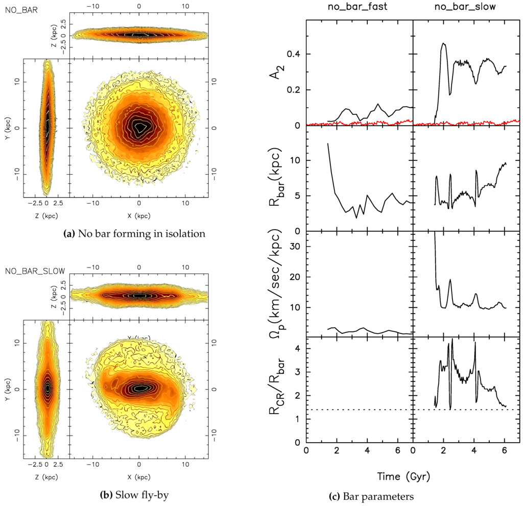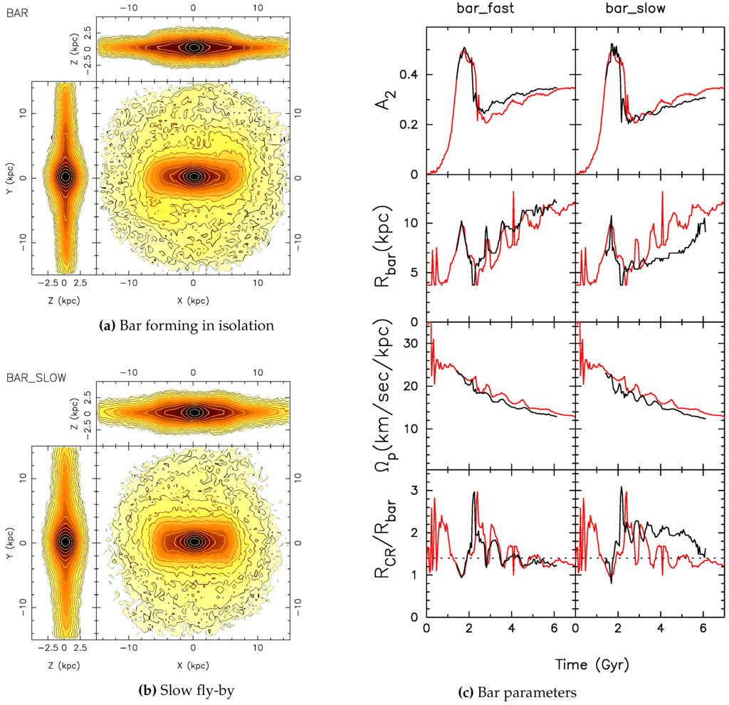 - Conversely, if the galaxy is not able to form the bar in isolation, a slow interaction is able to develop a strong bar in the galaxy.