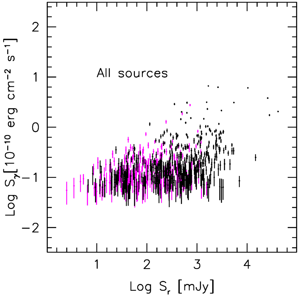Figure 1. Gamma-ray energy flux at MeV vs 8 GHz radio flux density for the 1LAC sample. Adapted from [1]. Magenta symbols indicate sources without a measured redshift. - The chance probability of obtaining this value from two intrinsically uncorrelated quantities with the same dynamic range in flux density is smaller than ;