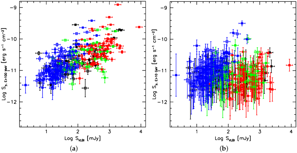 - Ackermann, M.; Ajello, M.; Allafort, A.; Angelakis, E.; Axelsson, M.; Baldini, L.; Ballet, J.; Barbiellini, G.; Bastieri, D.; Bellazzini, R.; Berenji, B. The Radio/Gamma-Ray Connection in Active Galactic Nuclei in the Era of the Fermi Large Area Telescope. Astrophys. J. 2011, 741, 33. [Google Scholar] [CrossRef]