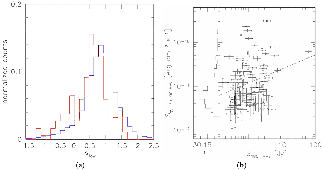 (a): Cumulative distribution function for the low frequency spectral index of the entire MWACS catalogue (red line) and the blazar subset (blue line); (b): Gamma-ray energy flux at MeV vs. 120 MHz flux density (main panel) or upper limits (side histogram). Adapted from [25]. Reproduced with permission from Astronomy & Astrophysics, © ESO.