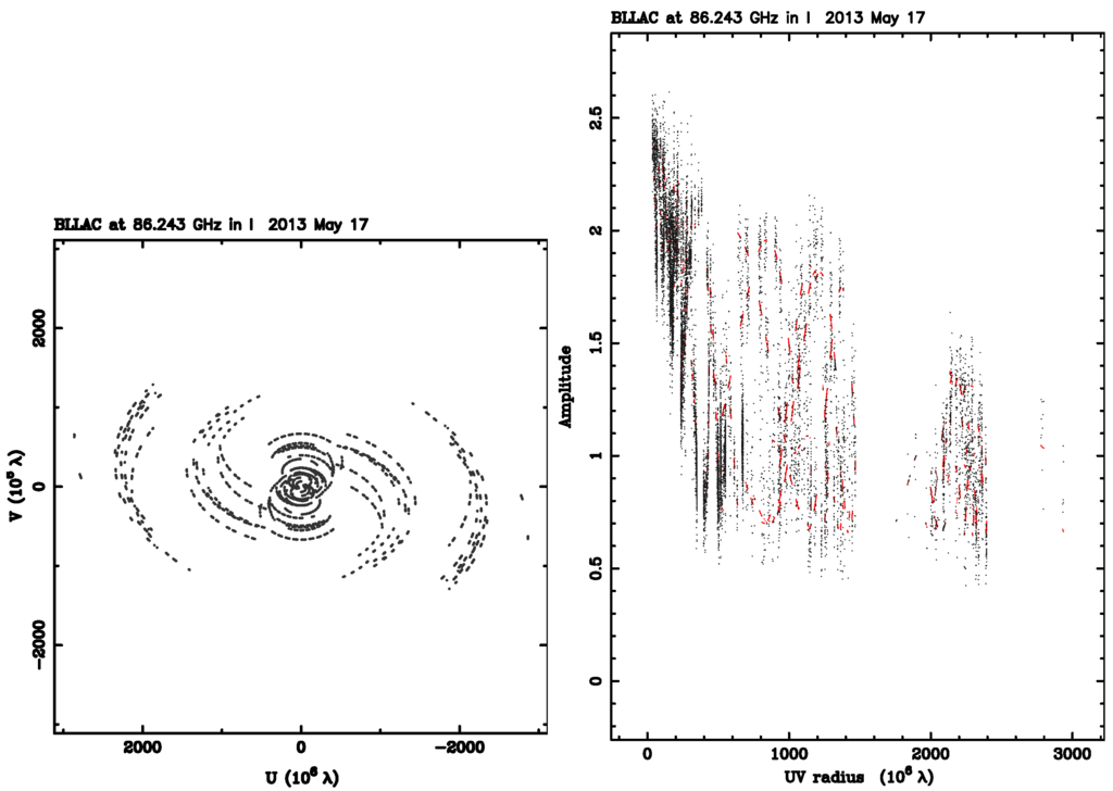 (Left): UV-plot for BL Lac at 86 GHz on May 17, 2013; (Right): Correlated flux versus projected baseline (data in dark-grey and source model in red).