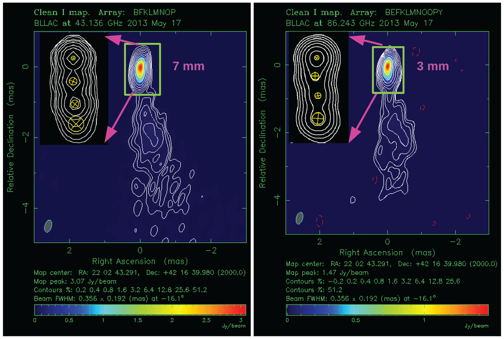 Figure 2 shows the 7 mm (left) and 3 mm (right) total intensity maps of BL Lac for an experiment conducted on 17 May 2013. The 3 mm map is convolved with the 7 mm beam to compare the extended jet morphology. The two images look very similar. However, the extended jet region is much fainter at 3 mm than at 7 mm. In the top left corner, we show a zoomed version of the inner jet region (<0.4 mas), which corresponds to a linear distance of <5000 gravitational radii in the source frame. The inner jet region can be well described by four circular Gaussian components (yellow circles) both at 43 (7 mm) and 86 GHz (3 mm) frequencies. This implies a similarity of jet morphology in the inner region as well. The simultaneous multi-frequency observations will be used to determine the spectral turnover for individual jet knots. Given their spectral indices and VLBI sizes, the magnetic field at different jet locations can be determined. The estimated magnetic field strengths at different separations from the jet apex will then be used to constrain the magnetic field strength at the jet apex. Recent evidence suggests that the central black holes in jetted AGN are surrounded by magnetically arrested disks [18], which implies high magnetic fluxes close to the central engines. Our observations will provide observational constraints on the magnetic field strength and configuration close to the super-massive black holes.