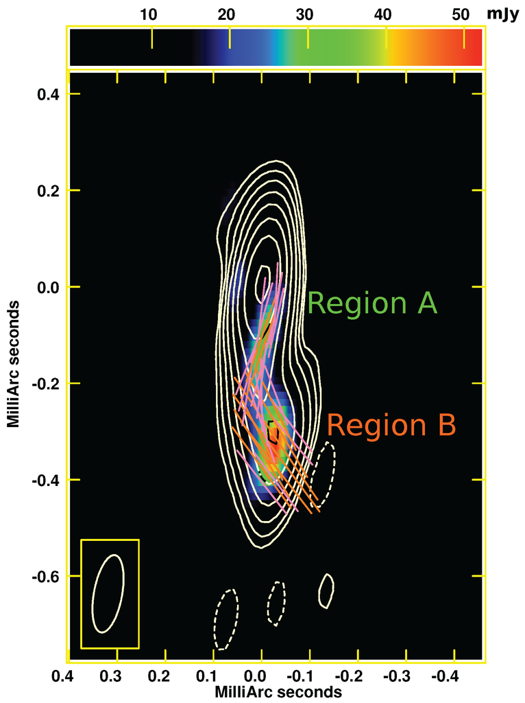 High-resolution intensity and polarization image of BL Lac at 86 GHz (3 mm) obtained on May 17, 2013 (beam FWHM: 0.172 × 0.0748 mas at −). Contours represent total intensity and the peak flux is 1.04 Jy/beam; contour levs are (−0.07%, 0.07%, 0.14%, 0.28%, 0.56%, 1.12%, 2.24%, 4.48%, 8.96%, 17.92%, 35.84%, 71.68%) of the peak flux. The polarized intensity is shown via the color scale. The solid ticks mark the EVPA direction.