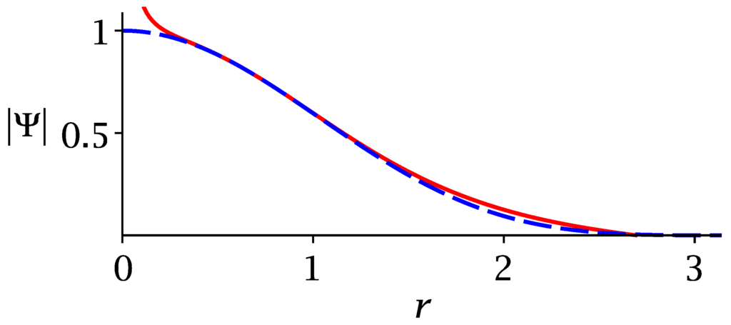 This equation can be solved numerically. Given that it is a fourth-order homogeneous differential equation in , it has a very large solution space, parameterized by boundary or initial conditions, such as the values of and its first three derivatives at some value of r. A hint for a suitable solution comes from numerical simulation [20], where we find that apparently stable nonrotating spherically symmetric solutions converge on , with . This approximate solution has many desirable properties. It is smooth in the interval . The corresponding kinetic energy (21) is finite in the same interval. Moreover, it is possible to compute the condensate mass, which is given by