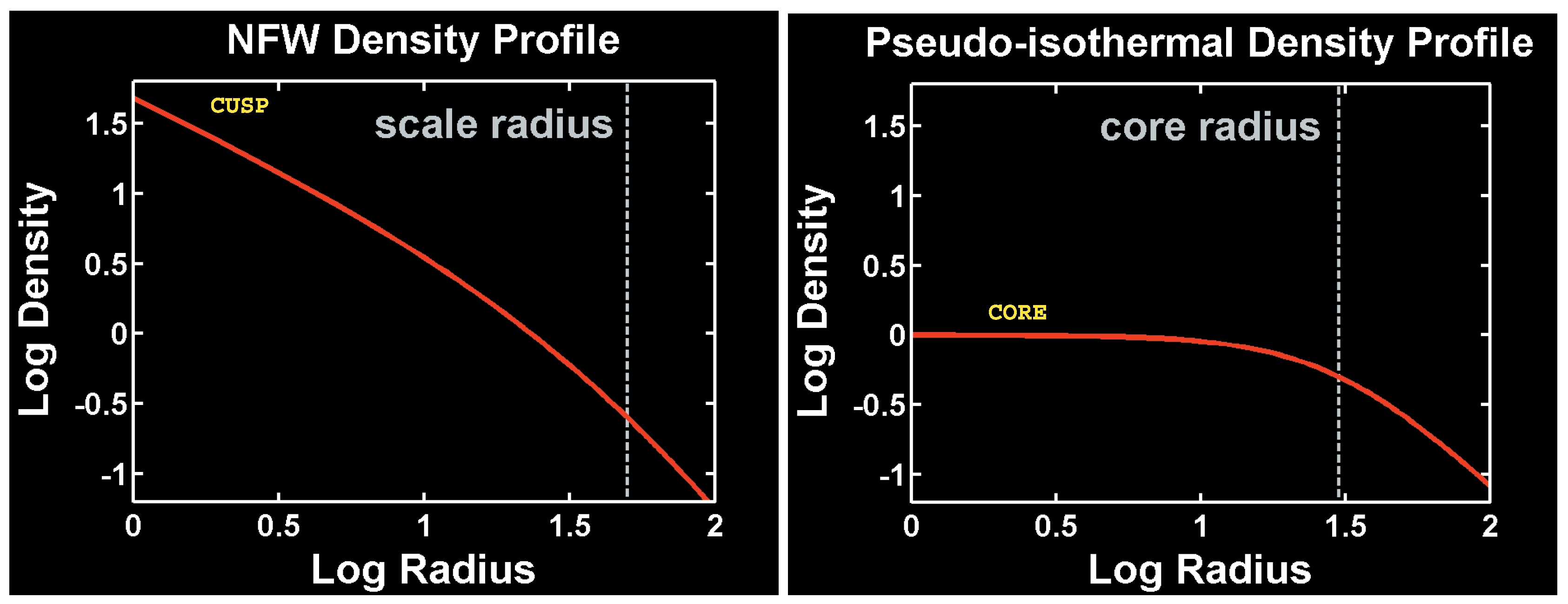 Flores & Primack [37] and Moore [31] ruled out cuspy profiles from DDO galaxies’ rotation curves, and showed them to be well approximated by cored (or pseudo-) isothermal density profiles. The problem then lies in the cuspy profiles produced in dissipationless simulations of the CDM model (see Figure 1).