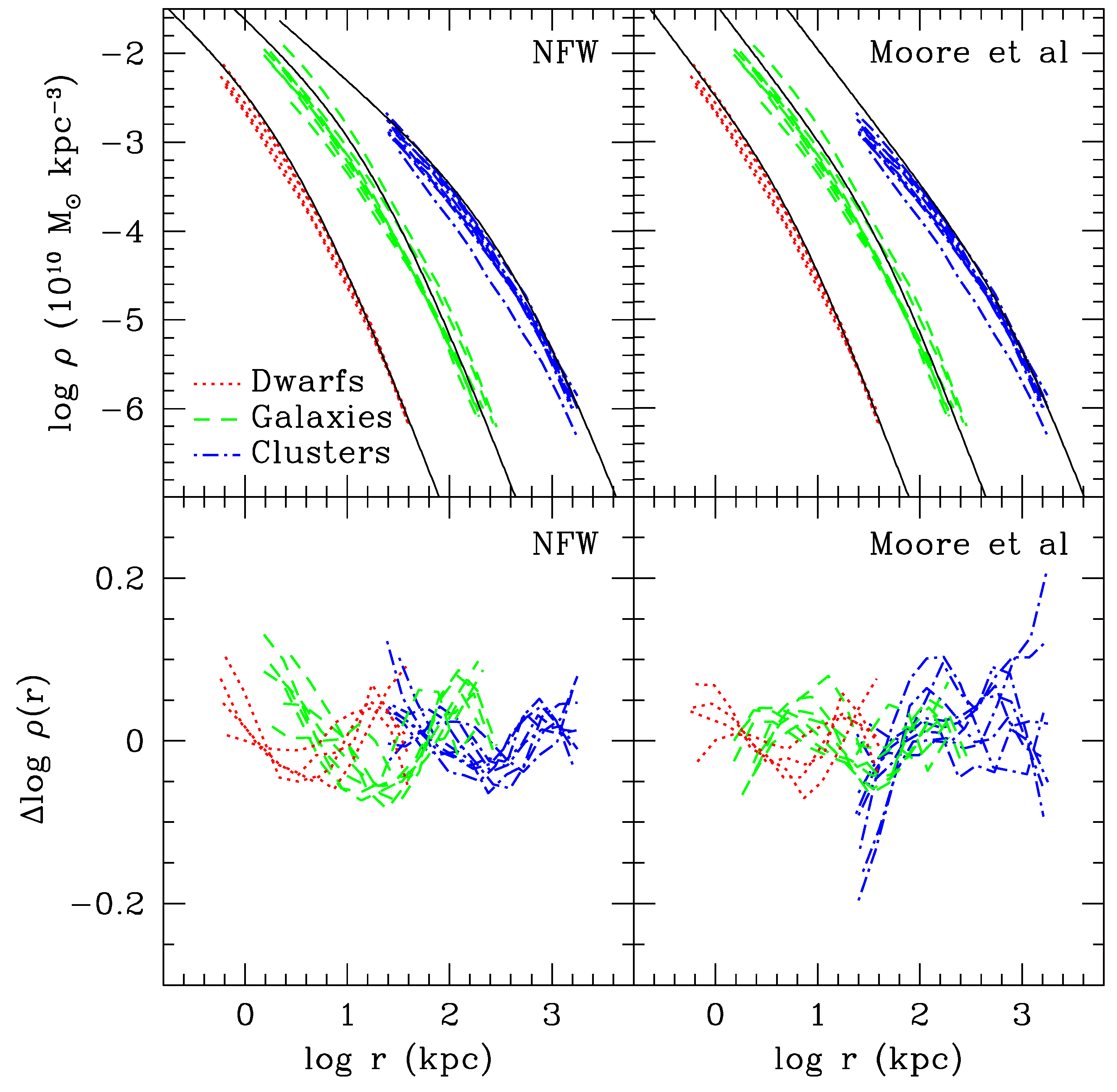 Density profiles comparison. The top left corner is a comparison of the NFW profile (solid line) with Ref. [187]’s simulations, that are well fitted by the Einasto profile [39], in the cases of dwarfs (red line), galaxies (green line), and clusters (blue line). The top right corner is the same as top left, but for the Moore profile. The bottom left and right corners display the residuals (Figure reproduced from [187]).
