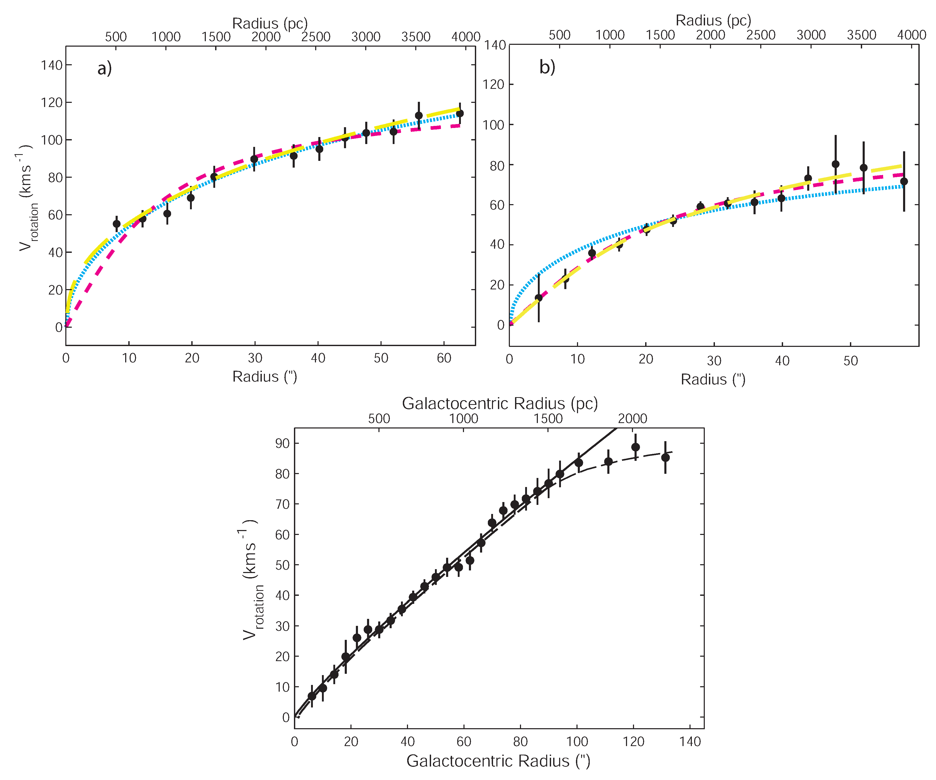 In Figure 4, the top left panel plots the DM halo RC of NGC5963 (black dots with error-bars), together with the RC obtained from a fitted NFW profile (cyan line), from a fitted pseudo-isothermal profile (ISO, short-dashed magenta line), and from the model of [166] (yellow dashed line) taking account of baryonic physics. The top right, and bottom panels display the same data for the cases of NGC5949, and NGC2976, respectively, with the same kind of fitted profiles for NGC5949, and just a flat power law (black line) and the same model [166] (dashed line) for NGC2976. The cuspy density profile of NGC5963 is well approximated by an NFW profile, which reflects in the RCs. NGC5949’s RC is fitted equally well by RCs from an ISO or an NFW profile, while NGC2976 displays a very flat inner density (. All the three RCs are well approximated by the [168] model.