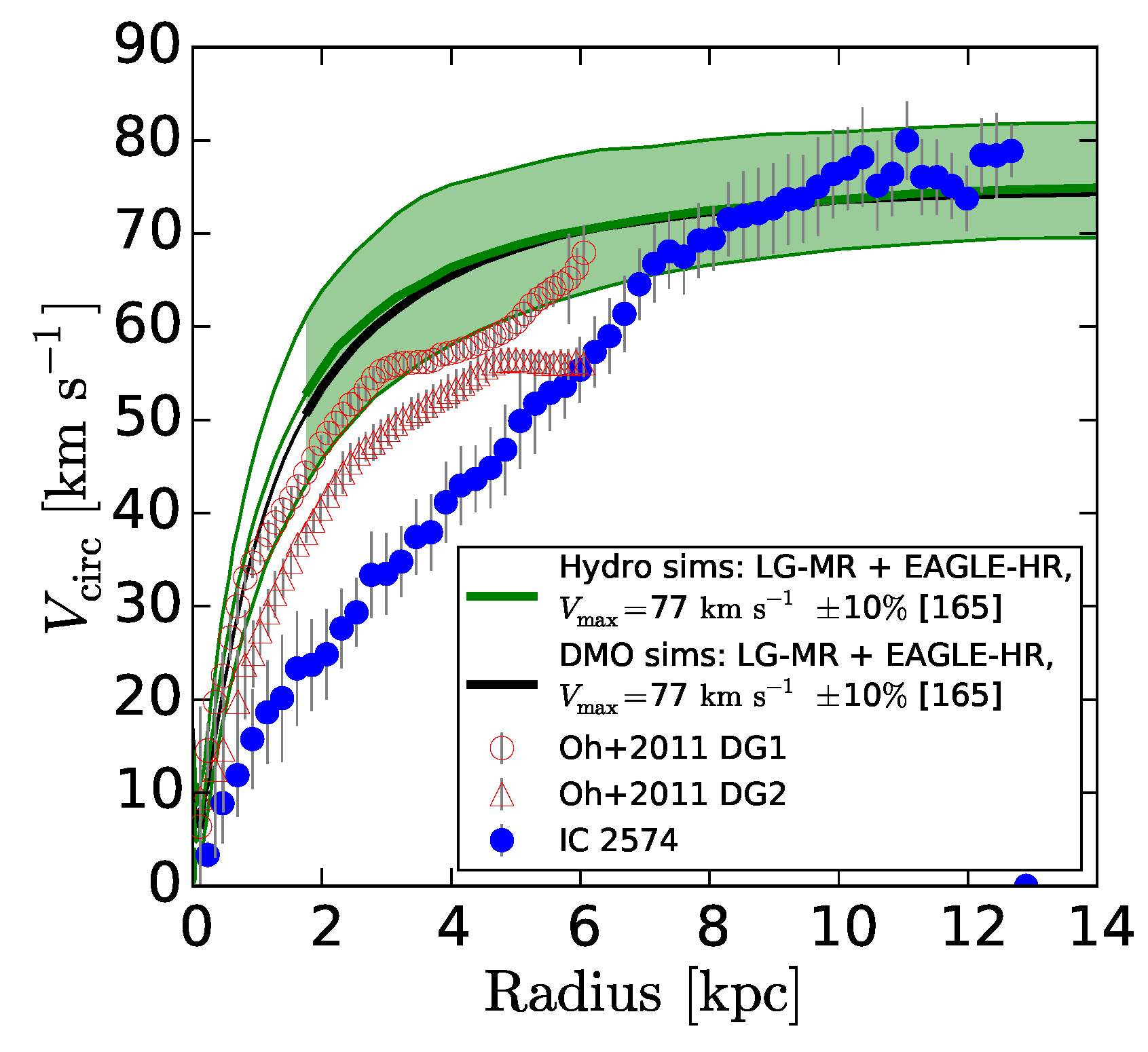 Comparison of the observed IC2574 RC (filled circles) with the two simulated galaxies DG1, and DG2 of [58]. The green line, and shaded region, represent respectively the median rotation velocity, and scatter, of the galaxies simulated by [196] (from which this figure is reproduced).
