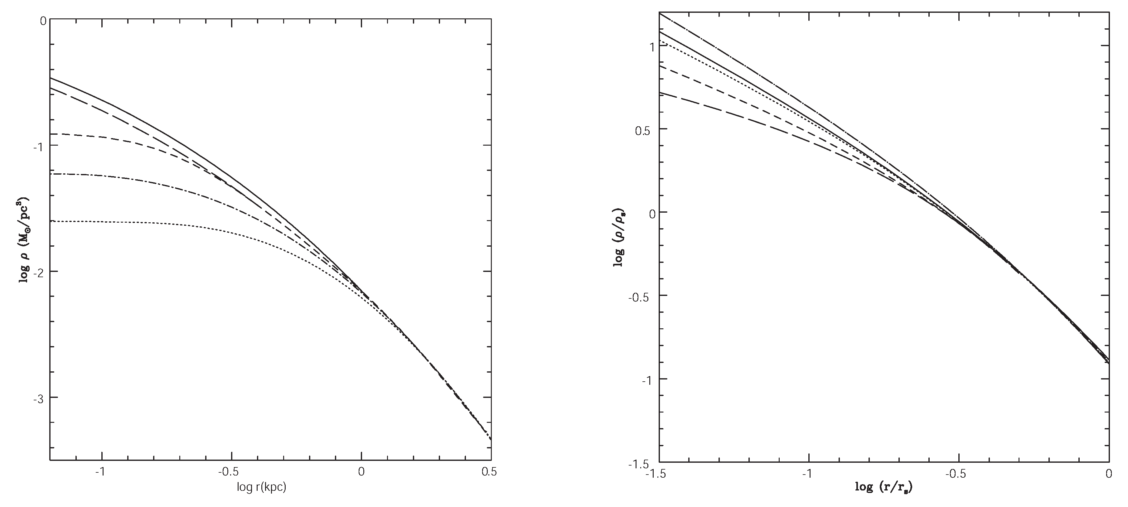 Left panel: evolution of the density profile of a halo [166] (see the discussion on the DFBC scenario). The profile at , and 0, are represented by the solid line, long-dashed line, short-dashed line, dot-dashed line, and dotted line, respectively. Right panel: evolution of the density profile of a halo of [166] (see the discussion on the DFBC scenario). The dot-dashed line represents the total mass density profile (DM+Baryons) at , while the DM profile at 1 and 0 is represented by the solid line, dotted-line, short-dashed line, and long-dashed line, respectively (figure reproduced from [166]).