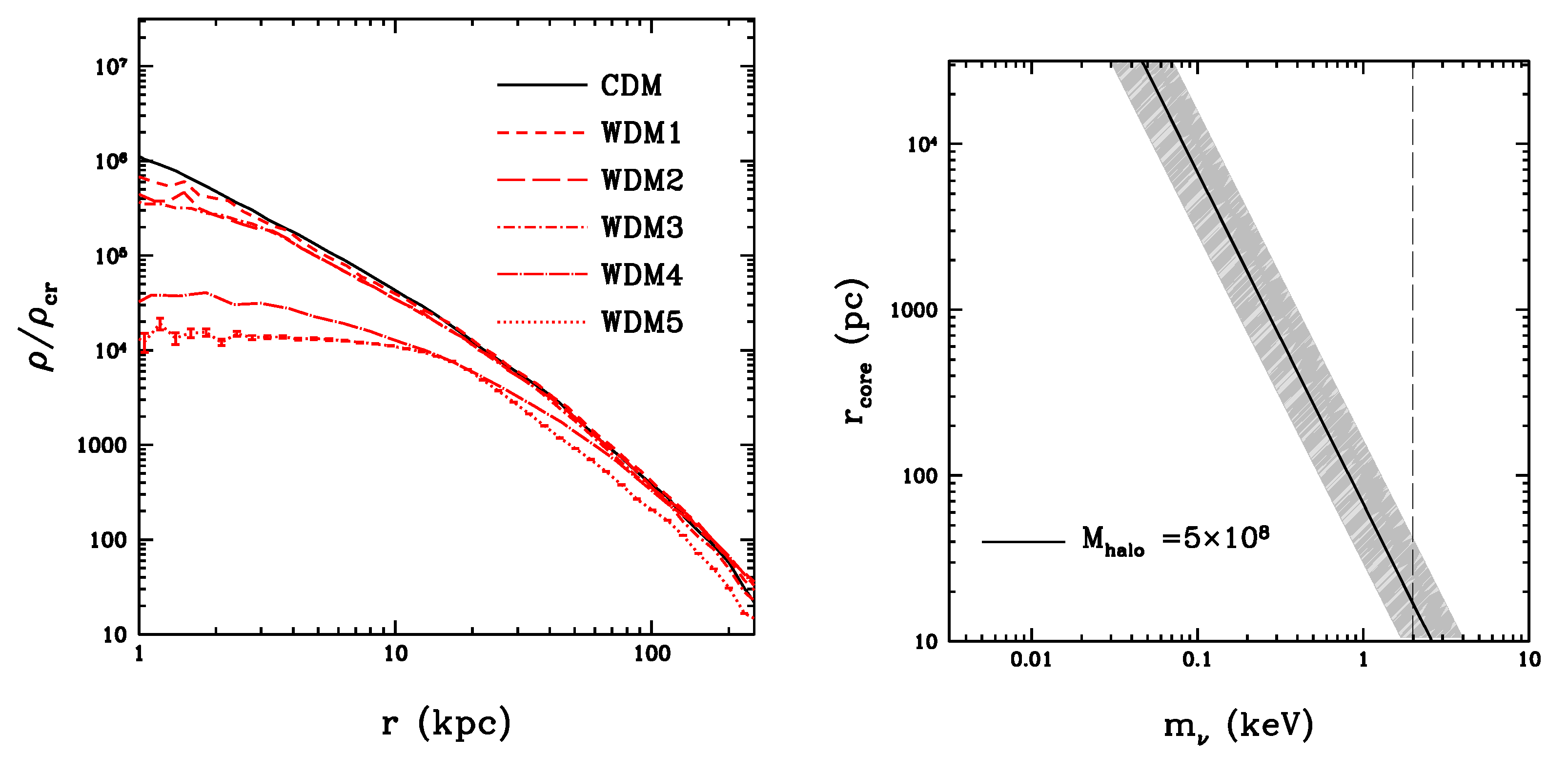 - Macciò, A.V.; Paduroiu, S.; Anderhalden, D.; Schneider, A.; Moore, B. Cores in warm dark matter haloes: A Catch 22 problem. Mon. Not. Roy. Astro. Soc. 2012, 424, 1105–1112. [Google Scholar] [CrossRef]