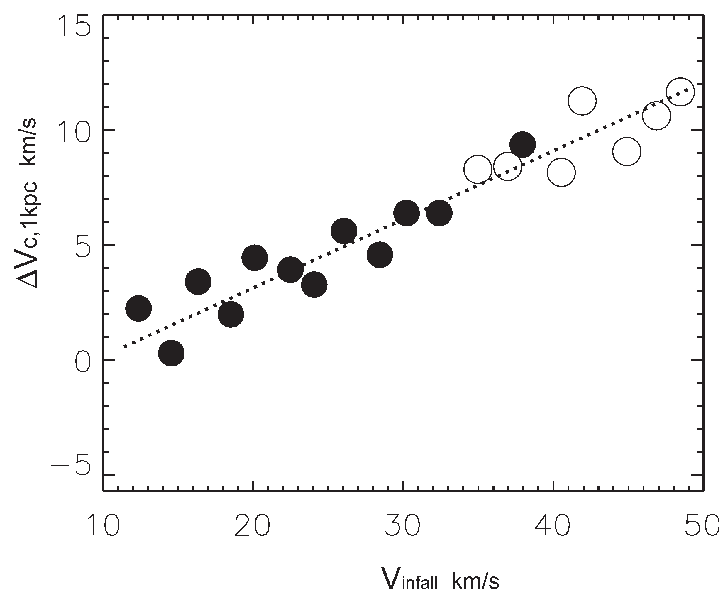 Several authors used spherical [252,253,254,255,256,257,258,259,260,261,262,263], or elliptic [264] infall models3, arriving to the conclusion that the larger the angular momentum of a proto-structure, the flatter its inner density profile, and finding agreement with the rotation curves of dwarfs [256]. Since the angular momentum acquired by a structure is anticorrelated with the peak height4, the density profile of dwarfs is flatter than that of giant galaxies.