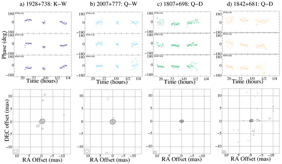 Outcomes of Source Frequency Phase Referencing (SFPR) astrometric analysis: Upper Row: SFPR-ed residual visibility phases for a subset of source and frequency pairs. The target source and target frequency band (i.e., ), along with the angular separation to the reference source (in all cases 1803+784), the reference frequency band (i.e., ) and the frequency ratio R, in parenthesis, are as follows for each plot. From left to right: 1928+738 at W-band ( apart on the sky, K-band, R = 4); 2007+777 at W-band ( apart, Q-band, R = 2); 1807+698 at D-band ( apart, Q-band, R = 3); 1842+681 at D-band ( apart, Q-band, R = 3). Lower Row: SFPR-ed maps resulting from Fourier transformation of the SFPR-ed visibility phases directly above. From left to right: 1928+738 and 2007+777 at 87 GHz (W-band); 1807+698 and 1842+681 at 130 GHz (D-band). Peak fluxes are 2 Jy·beam, 266 mJy·beam, 415 mJy·beam and 216 mJy·beam, respectively. The contour levels in the maps start from 0.75% of the corresponding peak fluxes, respectively, and doubling thereafter in all cases. Each map includes a negative contour level at the same percent level of the peak flux as the first positive one. The beam size is indicated at the bottom left of the image.